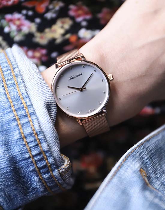 Женские часы с минеральным стеклом Adriatica A3573.9147Q, кварцевый механизм с высокой точностью. Класс водозащиты: 30 метров, позволит защитить корпус от случайных брызг или капель дождя. Корпус часов изготовлен из стали, розового цвета.