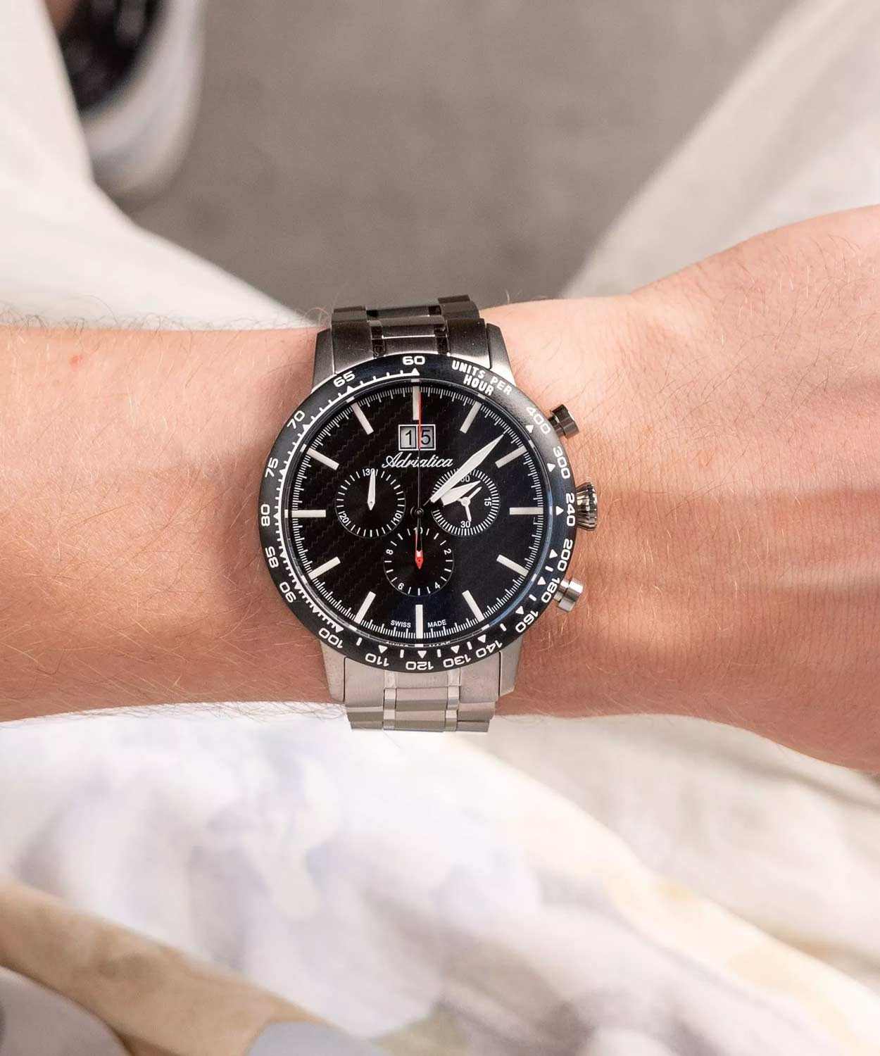 Мужские швейцарские часы-хронографХронографФункция позволяет измерять отрезки времени с особой точностью: часы, минуты, секунды. Верным признаком хронографа является наличие на циферблате 3 дополнительных окошек-счётчиков. с секундомеромСекундомерСекундоме́р — прибор, способный измерять интервалы времени с точностью до долей секунды. и тахиметромТахиметрРазмеченная шкала, располагается на ободке или безеле часов. Тахиметр позволяет рассчитать скорость на определённом участке пути, расстояние измеряется в километрах или милях. Adriatica Aviation A8383.4114CH воплощают в себе элегантность и функциональность, их выбирают целеустремленные мужчины, которые знают цену времени. Черный циферблат часов, защищенный сапфировым стекломСапфировое стеклоПрочный и надёжный материал из кристалла сапфира синтетического происхождения, характеризующийся особой твёрдостью и устойчивостью к царапинам и повреждениям., заключен в корпус из титана диаметром 46 мм и толщиной 12 мм. Надежный кварцевый механизм с калибром Ronda 5040.B обеспечивает высокую точность, а водозащита 5 ATM делает часы устойчивыми к воздействию воды. Стальной браслет с раскладной застёжкойРаскладная застёжкаТакой тип застёжки используется только на браслетах из металла. Она никогда не раскрывается полностью, происходит разделение на 2 и более частей. Раскладывающая застёжка снизит вероятность потери часов к минимуму. обеспечивает комфортное и надежное ношение. Циферблат с метками в виде штрихов имеет 3 дополнительных циферблата, а также окошко даты в положении «12» , что добавляет практичности в повседневной жизни. Люминесцентное покрытиеЛюминесцентное покрытиеПозволяет считывать показания времени в темноте. Производители наносят на стрелки, часовые индексы, безель или поверхность циферблата светонакопительный состав, дающий холодное свечение. на стрелках и метках обеспечивает отличную видимость в темноте.