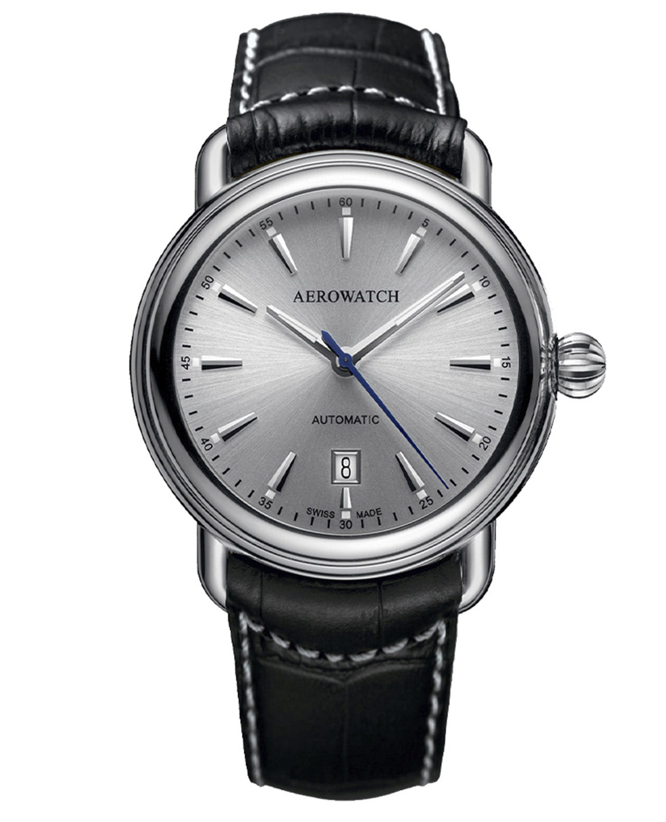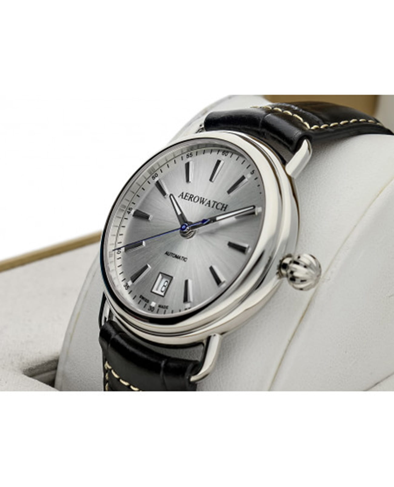 Мужские швейцарские часы с Aerowatch Renaissance 1942 60900 AA19, кварцевый механизм с высокой точностью. Сапфировое стеклоСапфировое стеклоПрочный и надёжный материал из кристалла сапфира синтетического происхождения, характеризующийся особой твёрдостью и устойчивостью к царапинам и повреждениям. устойчивое к появлению царапин, обладающее высокой прозрачностью. Корпус изготовлен из нержавеющей стали. Серебристый sunray циферблат украшен родированными индексами и метками с люминесцентным покрытиемЛюминесцентное покрытиеПозволяет считывать показания времени в темноте. Производители наносят на стрелки, часовые индексы, безель или поверхность циферблата светонакопительный состав, дающий холодное свечение., окошко даты в положении 6 часов. Класс водозащиты: 50 метров, позволит защитить корпус от случайных брызг или капель дождя. Кожаный ремешок на стандартной застёжке.