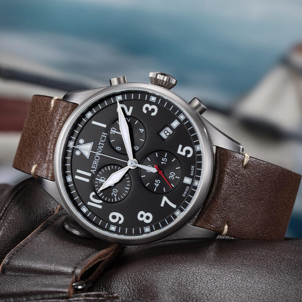 Мужские швейцарские часы-хронографХронографФункция позволяет измерять отрезки времени с особой точностью: часы, минуты, секунды. Верным признаком хронографа является наличие на циферблате 3 дополнительных окошек-счётчиков. Aerowatch Les Grandes Classiques 79990 AA03, кварцевый механизм с высокой точностью. Сапфировое стеклоСапфировое стеклоПрочный и надёжный материал из кристалла сапфира синтетического происхождения, характеризующийся особой твёрдостью и устойчивостью к царапинам и повреждениям. устойчивое к появлению царапин, обладающее высокой прозрачностью. Корпус изготовлен из нержавеющей стали. На циферблате 3 счетчика, стрелки и метки с люминесцентным покрытиемЛюминесцентное покрытиеПозволяет считывать показания времени в темноте. Производители наносят на стрелки, часовые индексы, безель или поверхность циферблата светонакопительный состав, дающий холодное свечение., окошко даты в положении 4 часов. Класс водозащиты: 50 метров, позволит защитить корпус от случайных брызг или капель дождя. Кожаный ремешок на стандартной застёжке.