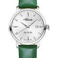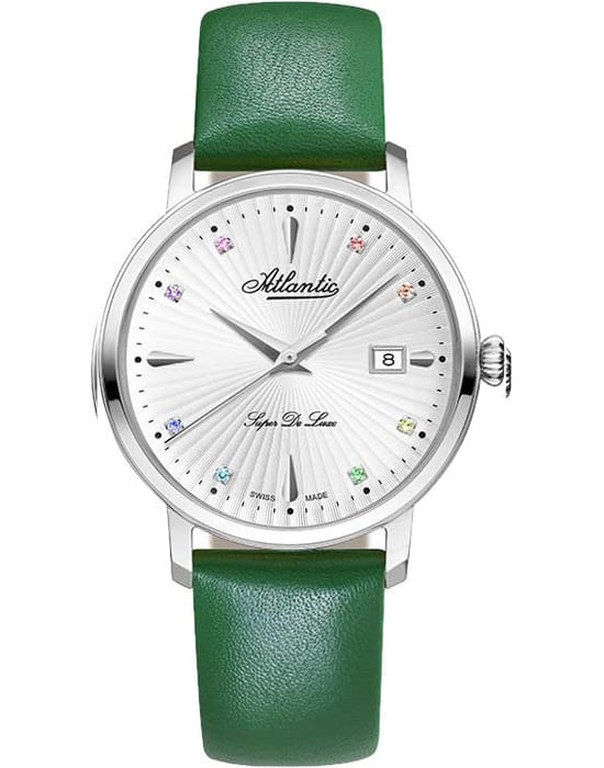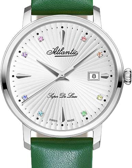 Женские швейцарские часы Atlantic Super De Luxe Precious Stones Rainbow Edition 29355.41.29LGN, кварцевый механизм с высокой точностью. Циферблат часов с сапфировым стекломСапфировое стеклоПрочный и надёжный материал из кристалла сапфира синтетического происхождения, характеризующийся особой твёрдостью и устойчивостью к царапинам и повреждениям., устойчивым к появлению царапин и обладающее высокой прозрачностью. Класс водозащиты: 30 метров, позволит защитить корпус от случайных брызг или капель дождя. Корпус часов изготовлен из нержавеющей стали. Кожаный ремешок на стандартной застёжке. Гильошированный циферблат с метками в виде точек украшен кристаллами. Окошко даты находится в положении 3 часа.