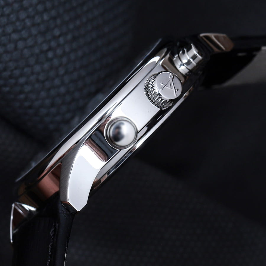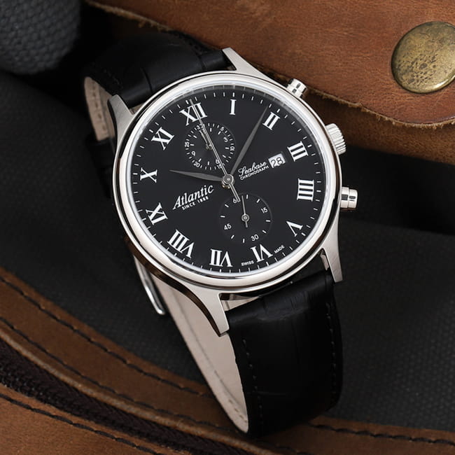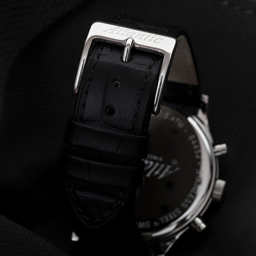 Мужские швейцарские часы-хронографХронографФункция позволяет измерять отрезки времени с особой точностью: часы, минуты, секунды. Верным признаком хронографа является наличие на циферблате 3 дополнительных окошек-счётчиков. с секундомеромСекундомерСекундоме́р — прибор, способный измерять интервалы времени с точностью до долей секунды. Atlantic Seabase 64452.41.68, кварцевый механизм с высокой точностью. Cапфировое стеклоСапфировое стеклоПрочный и надёжный материал из кристалла сапфира синтетического происхождения, характеризующийся особой твёрдостью и устойчивостью к царапинам и повреждениям. устойчивое к появлению царапин и обладающее высокой прозрачностью. Корпус часов изготовлен из нержавеющей стали. На циферблате расположены римские цифры, два дополнительных индикатора, окошко даты в положении 3 часов. Класс водозащиты: 50 метров, позволит защитить корпус от случайных брызг или капель дождя. Кожаный ремешок на стандартной застежке.