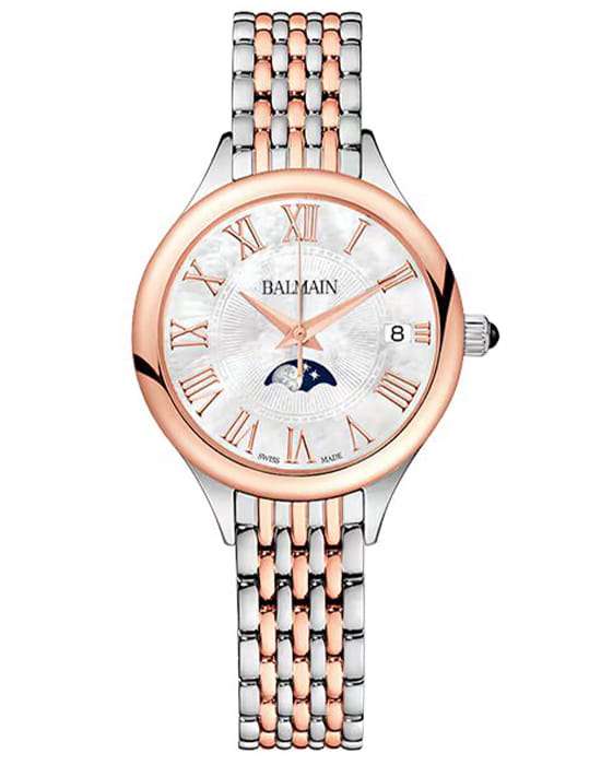 Женские часы Balmain de Balmain B4918.33.82 кварцевый механизм с высокой точностью. Сапфировое стеклоСапфировое стеклоПрочный и надёжный материал из кристалла сапфира синтетического происхождения, характеризующийся особой твёрдостью и устойчивостью к царапинам и повреждениям. устойчивое к появлению царапин, обладающее высокой прозрачностью. Корпус изготовлен из нержавеющей стали. Класс водозащиты: 50 метров, позволит защитить корпус от случайных брызг или капель дождя. Стальной браслет с частичным PVD-покрытиемPVDУльтратонкое покрытие наносится в технике вакуумного напыления, сочетает в себе нитрид титана особой прочности со слоем золота или оксида хрома. Несёт в себе декоративную или защитную функцию.. на застёжке «бабочка» с кнопкамиЗастёжка "бабочка"Такой вид застёжки дополняется предохранителями, помогающими избежать случайного раскрытия браслета. Обладают изящным исполнением. . БезельБезельВнешний ободок, закрепляющий стекло. В спортивных часах так называется поворотное кольцо с делениями на циферблате, выполняет роль таймера – замеряет отрезки времени на шкале. Неподвижный безель – элемент декора. Однонаправленно вращающийся безель на дайверских часах позволяет фиксировать моменты погружения и выныривания на поверхность. с PVD-покрытиемPVDУльтратонкое покрытие наносится в технике вакуумного напыления, сочетает в себе нитрид титана особой прочности со слоем золота или оксида хрома. Несёт в себе декоративную или защитную функцию.. Лунный календарь в позиции 6 часов.