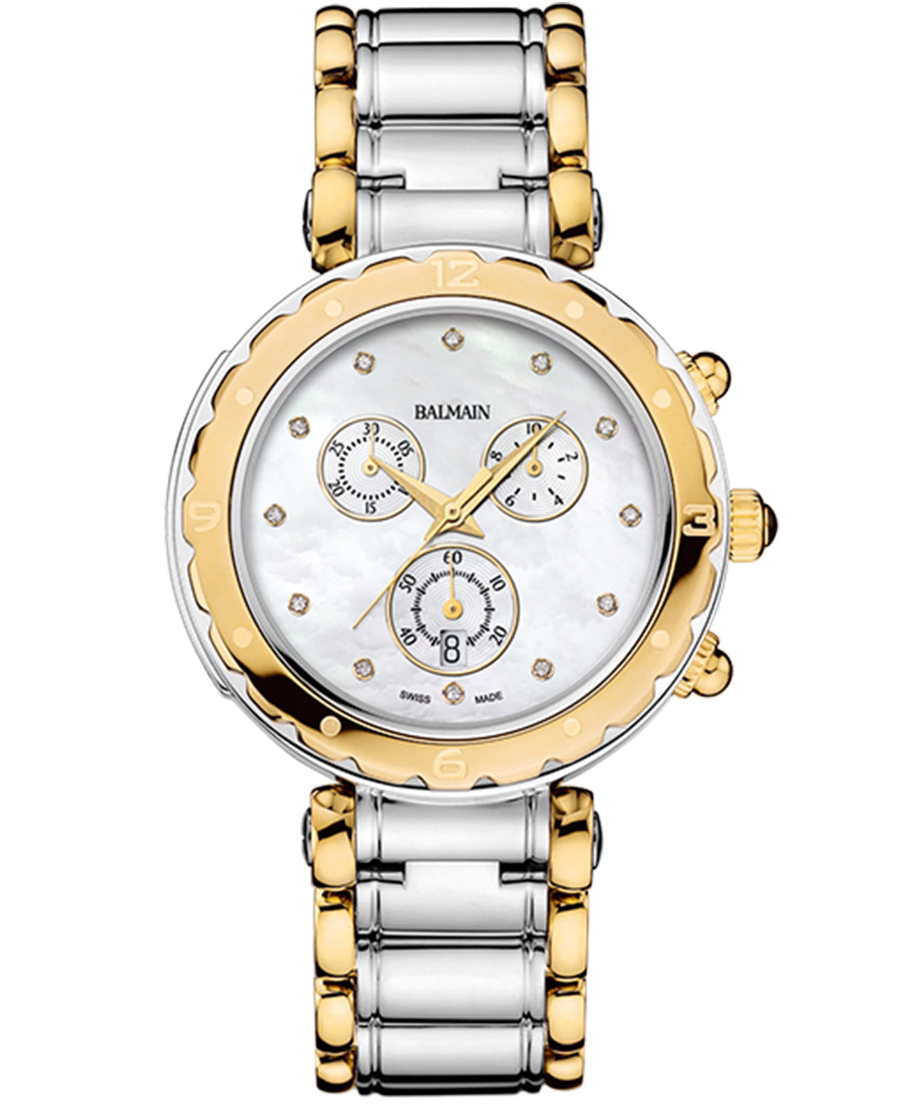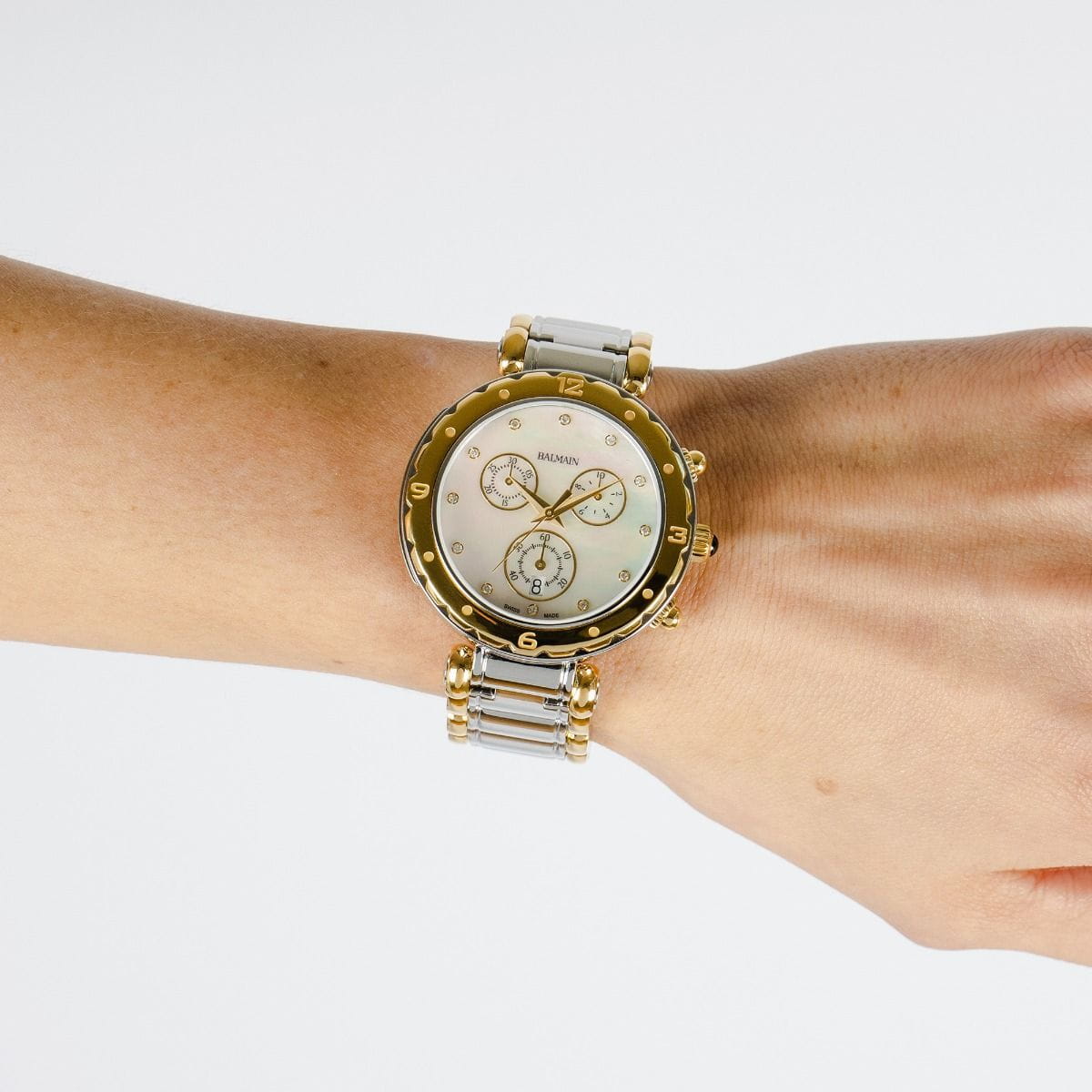 Женские часы Balmain Balmainia B5632.39.85 c хронографомХронографФункция позволяет измерять отрезки времени с особой точностью: часы, минуты, секунды. Верным признаком хронографа является наличие на циферблате 3 дополнительных окошек-счётчиков. кварцевый механизм с высокой точностью. Сапфировое стеклоСапфировое стеклоПрочный и надёжный материал из кристалла сапфира синтетического происхождения, характеризующийся особой твёрдостью и устойчивостью к царапинам и повреждениям. устойчивое к появлению царапин, обладающее высокой прозрачностью. Корпус изготовлен из нержавеющей стали. Класс водозащиты: 50 метров, позволит защитить корпус от случайных брызг или капель дождя. Стальной браслет с PVD-покрытиемPVDУльтратонкое покрытие наносится в технике вакуумного напыления, сочетает в себе нитрид титана особой прочности со слоем золота или оксида хрома. Несёт в себе декоративную или защитную функцию.. на застёжке «бабочка» с кнопкамиЗастёжка "бабочка"Такой вид застёжки дополняется предохранителями, помогающими избежать случайного раскрытия браслета. Обладают изящным исполнением. .БезельБезельВнешний ободок, закрепляющий стекло. В спортивных часах так называется поворотное кольцо с делениями на циферблате, выполняет роль таймера – замеряет отрезки времени на шкале. Неподвижный безель – элемент декора. Однонаправленно вращающийся безель на дайверских часах позволяет фиксировать моменты погружения и выныривания на поверхность. с PVD-покрытиемPVDУльтратонкое покрытие наносится в технике вакуумного напыления, сочетает в себе нитрид титана особой прочности со слоем золота или оксида хрома. Несёт в себе декоративную или защитную функцию..