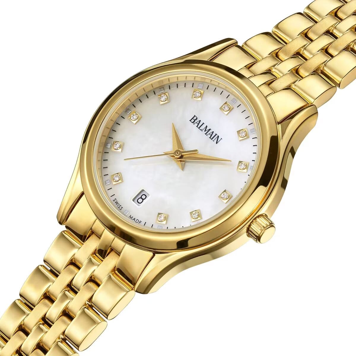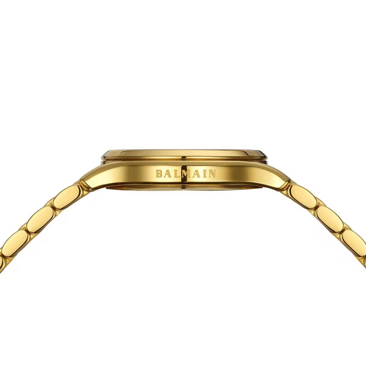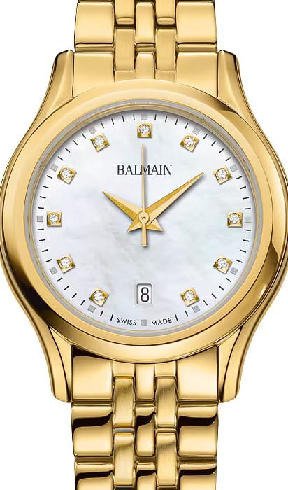 Женские часы Balmain Beleganza B8340.33.86 кварцевый механизм с высокой точностью. Сапфировое стеклоСапфировое стеклоПрочный и надёжный материал из кристалла сапфира синтетического происхождения, характеризующийся особой твёрдостью и устойчивостью к царапинам и повреждениям. устойчивое к появлению царапин, обладающее высокой прозрачностью. Корпус изготовлен из нержавеющей стали PVD-покрытиемPVDУльтратонкое покрытие наносится в технике вакуумного напыления, сочетает в себе нитрид титана особой прочности со слоем золота или оксида хрома. Несёт в себе декоративную или защитную функцию.. Класс водозащиты: 50 метров, позволит защитить корпус от случайных брызг или капель дождя. Стальной браслет с PVD-покрытиемPVDУльтратонкое покрытие наносится в технике вакуумного напыления, сочетает в себе нитрид титана особой прочности со слоем золота или оксида хрома. Несёт в себе декоративную или защитную функцию.. на застёжке «бабочка» с кнопкамиЗастёжка "бабочка"Такой вид застёжки дополняется предохранителями, помогающими избежать случайного раскрытия браслета. Обладают изящным исполнением. . БезельБезельВнешний ободок, закрепляющий стекло. В спортивных часах так называется поворотное кольцо с делениями на циферблате, выполняет роль таймера – замеряет отрезки времени на шкале. Неподвижный безель – элемент декора. Однонаправленно вращающийся безель на дайверских часах позволяет фиксировать моменты погружения и выныривания на поверхность. с PVD-покрытиемPVDУльтратонкое покрытие наносится в технике вакуумного напыления, сочетает в себе нитрид титана особой прочности со слоем золота или оксида хрома. Несёт в себе декоративную или защитную функцию.. Календарь в положении 6 часов. Циферблат с 11 бриллиантами группы Top Wesselton VS-SI общим весом 0.041 карата
