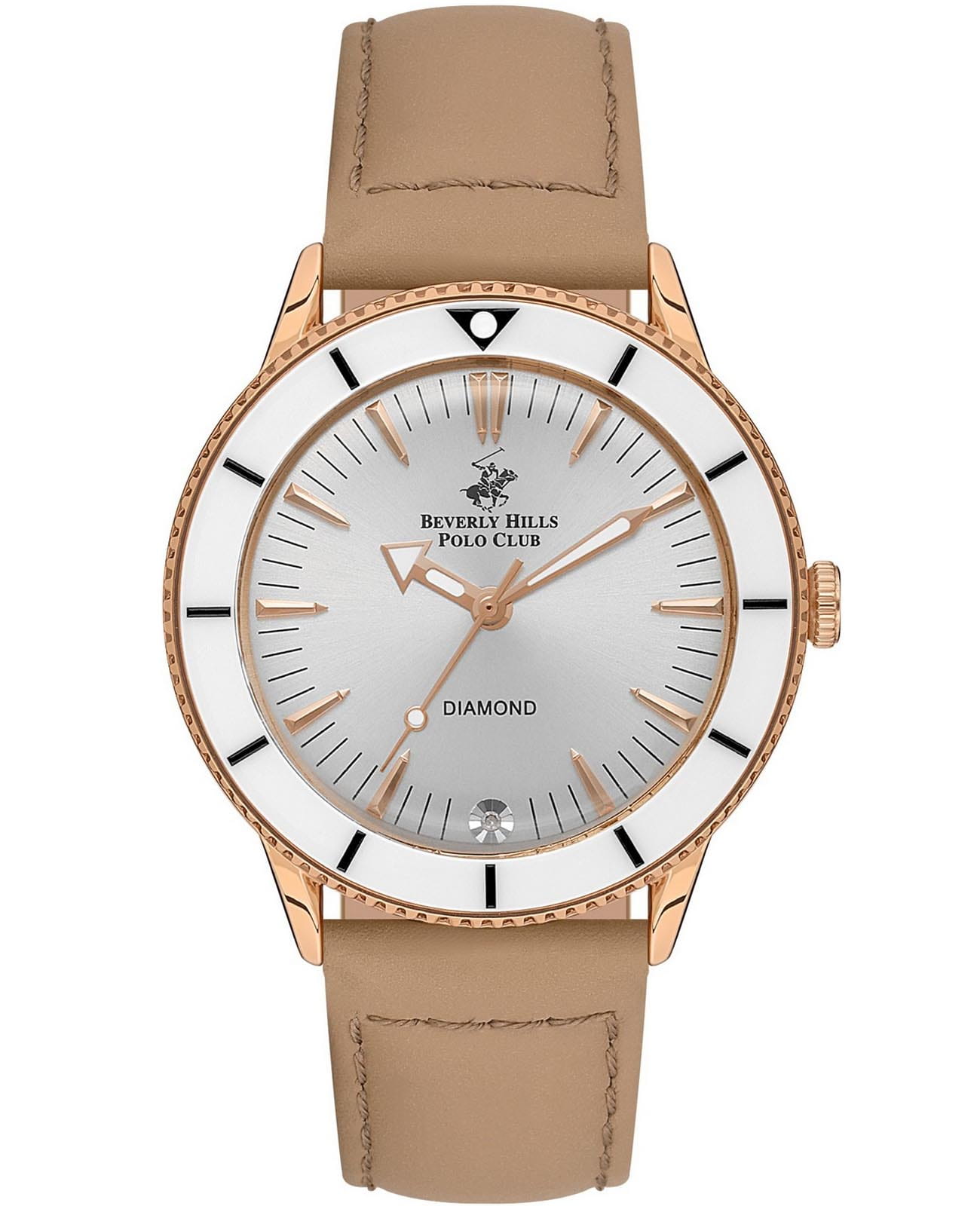 Американские женские часы с минеральным стекломМинеральное стеклоМинеральное стекло представляет собой искусственно выращенный минерал кварца. Такое стекло отличается особой устойчивостью к повреждениям и царапинам. Уступает по некоторым качествам сапфировому стеклу. Beverly Hills Polo Club BP3580C.434, кварцевый механизм с высокой точностью. Класс водозащиты: 50 метров, позволит защитить корпус от случайных брызг или капель дождя. Корпус часов изготовлен из суперметалла с IP-покрытиемIP-покрытиеМетод ионного напыления. Демонстрирует повышенную устойчивость к истиранию, окислению и химическим веществам. Под воздействием высокого давления и температуры около 1500°C молекулы металла надёжно соединяются с частицами корпуса часов.. Кожаный ремешок на стандартной застёжке. Стрелки и метки с люминесцентным покрытиемЛюминесцентное покрытиеПозволяет считывать показания времени в темноте. Производители наносят на стрелки, часовые индексы, безель или поверхность циферблата светонакопительный состав, дающий холодное свечение.. Циферблат инкрустирован синтетическим бриллиантом. БезельБезельВнешний ободок, закрепляющий стекло. В спортивных часах так называется поворотное кольцо с делениями на циферблате, выполняет роль таймера – замеряет отрезки времени на шкале. Неподвижный безель – элемент декора. Однонаправленно вращающийся безель на дайверских часах позволяет фиксировать моменты погружения и выныривания на поверхность. с PVD-покрытиемPVDУльтратонкое покрытие наносится в технике вакуумного напыления, сочетает в себе нитрид титана особой прочности со слоем золота или оксида хрома. Несёт в себе декоративную или защитную функцию..