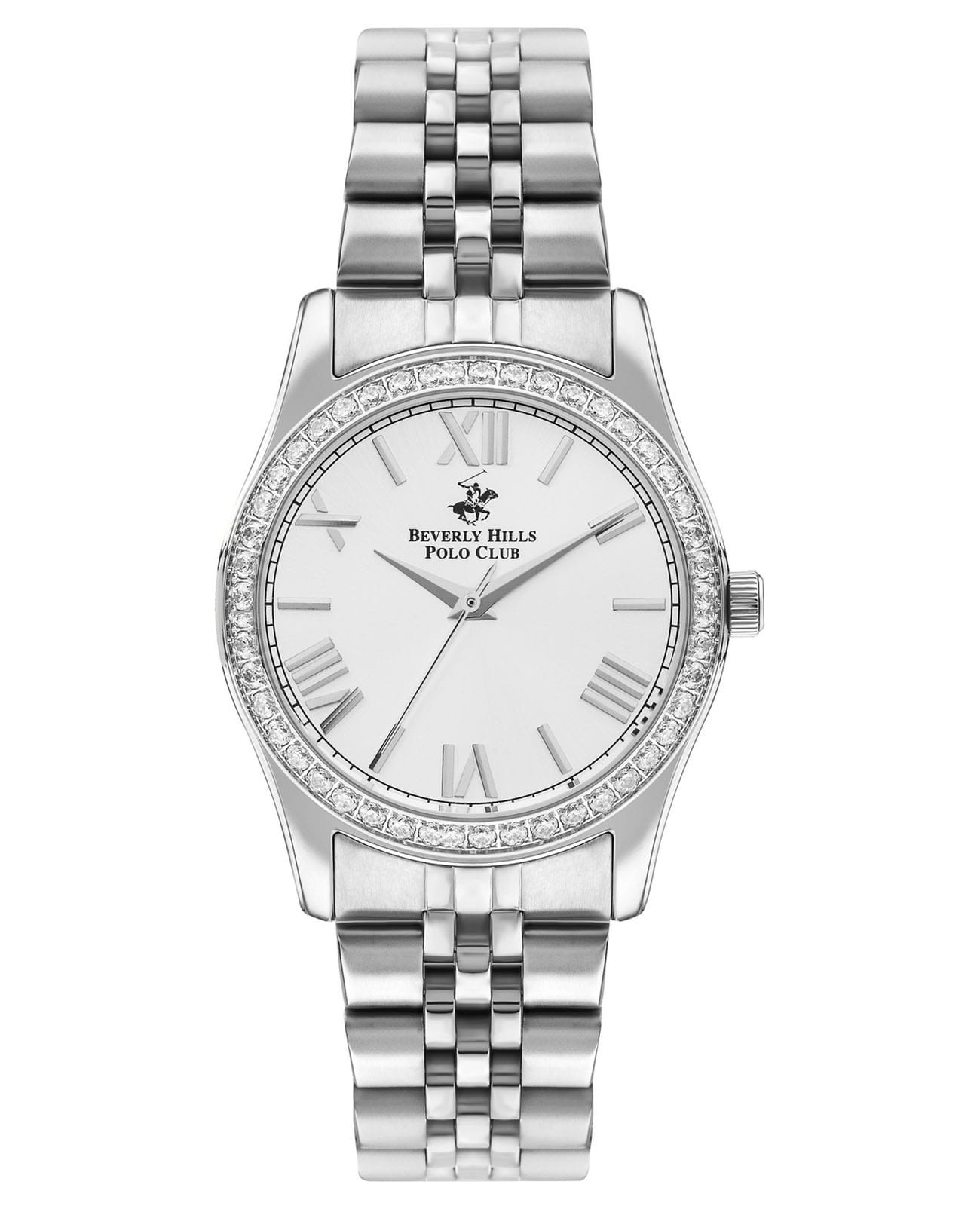 Американские женские часы с минеральным стекломМинеральное стеклоМинеральное стекло представляет собой искусственно выращенный минерал кварца. Такое стекло отличается особой устойчивостью к повреждениям и царапинам. Уступает по некоторым качествам сапфировому стеклу. Beverly Hills Polo Club BP3383C.330, кварцевый механизм с высокой точностью. Корпус и браслет часов изготовлены из нержавеющей стали. НеподвижныйбезельБезельВнешний ободок, закрепляющий стекло. В спортивных часах так называется поворотное кольцо с делениями на циферблате, выполняет роль таймера – замеряет отрезки времени на шкале. Неподвижный безель – элемент декора. Однонаправленно вращающийся безель на дайверских часах позволяет фиксировать моменты погружения и выныривания на поверхность. из нержавеющей стали украшен кристаллами. Класс водозащиты: 50 метров, позволит защитить корпус от случайных брызг или капель дождя. Стальной браслет на раскладной застёжкеРаскладная застёжкаТакой тип застёжки используется только на браслетах из металла. Она никогда не раскрывается полностью, происходит разделение на 2 и более частей. Раскладывающая застёжка снизит вероятность потери часов к минимуму..