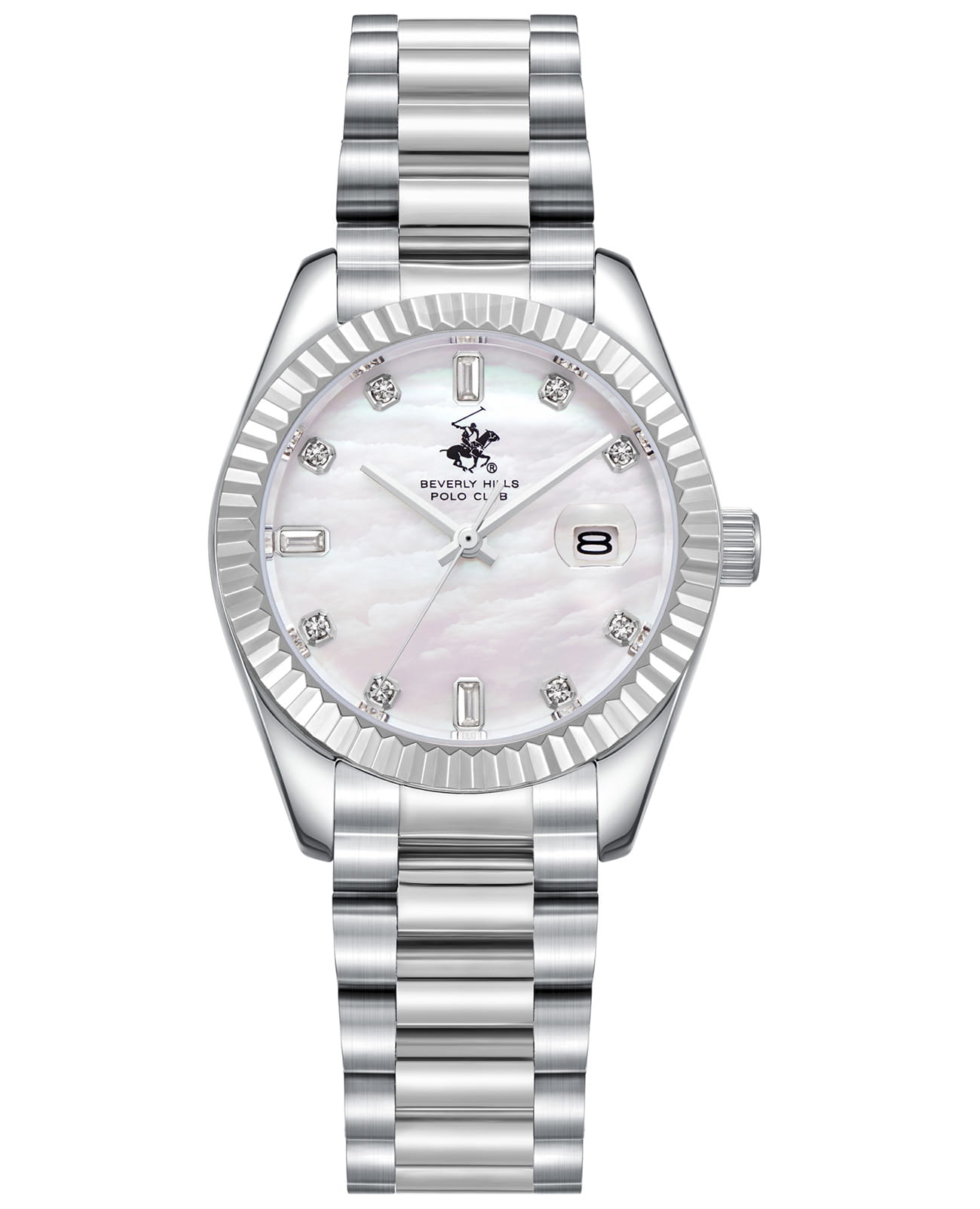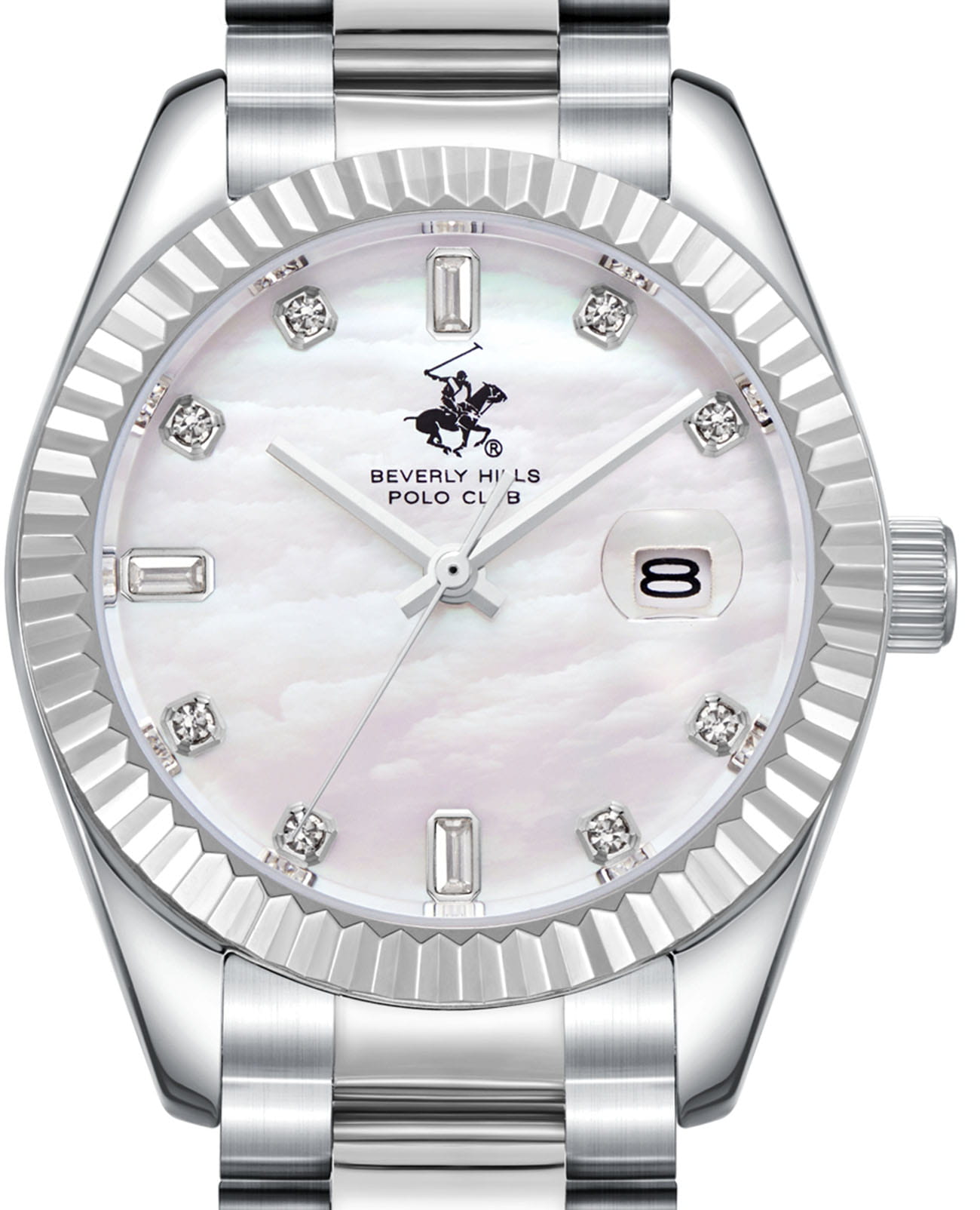 Женские кварцевые часы Beverly Hills Polo Club — это изысканный аксессуар, сочетающий традиции и современность. Корпус диаметром 32 мм выполнен из нержавеющей стали. БезельБезельВнешний ободок, закрепляющий стекло. В спортивных часах так называется поворотное кольцо с делениями на циферблате, выполняет роль таймера – замеряет отрезки времени на шкале. Неподвижный безель – элемент декора. Однонаправленно вращающийся безель на дайверских часах позволяет фиксировать моменты погружения и выныривания на поверхность. неподвижный, рифлёный. Циферблат перламутрового цвета оформлен точками с кристаллами и стрелками. Окошко даты расположено в положении 3 часов и оснащено увеличительным стеклом (Cyclops). Циферблат защищён минеральным стекломМинеральное стеклоМинеральное стекло представляет собой искусственно выращенный минерал кварца. Такое стекло отличается особой устойчивостью к повреждениям и царапинам. Уступает по некоторым качествам сапфировому стеклу. с сапфировым покрытием. Часы оснащены стальным браслетом на раскладной застёжкеРаскладная застёжкаТакой тип застёжки используется только на браслетах из металла. Она никогда не раскрывается полностью, происходит разделение на 2 и более частей. Раскладывающая застёжка снизит вероятность потери часов к минимуму.. Водонепроницаемость 30 м позволяет использовать часы в повседневных условиях. Идеальный выбор для тех, кто ценит американское качество и универсальный дизайн.
