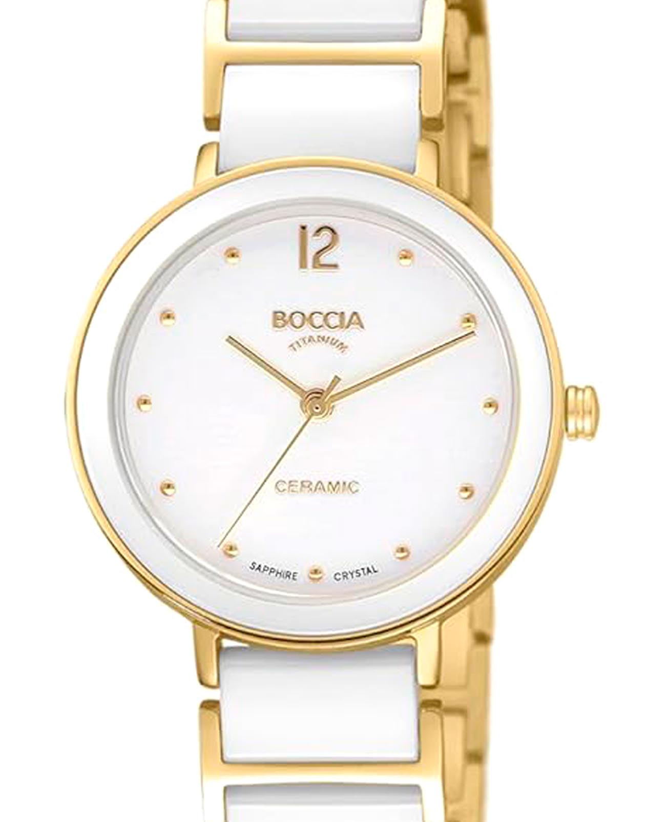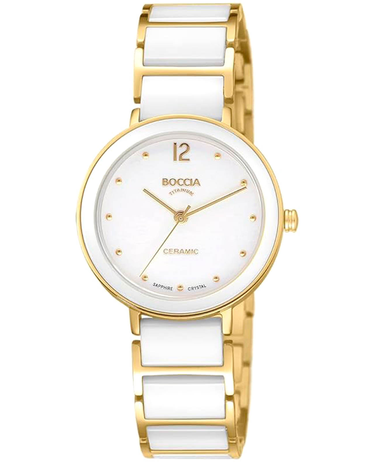 Женские немецкие титановые часы Boccia Titanium 3331-03 с надёжным кварцевым механизмом. Корпус изготовлен из титана диаметром 34мм подчеркивает современный дизайн модели. Сапфировое стеклоСапфировое стеклоПрочный и надёжный материал из кристалла сапфира синтетического происхождения, характеризующийся особой твёрдостью и устойчивостью к царапинам и повреждениям. устойчивое к появлению царапин, обладающее высокой прозрачностью. Титановый браслет с PVD-покрытиемPVDУльтратонкое покрытие наносится в технике вакуумного напыления, сочетает в себе нитрид титана особой прочности со слоем золота или оксида хрома. Несёт в себе декоративную или защитную функцию. и керамическими вставками на раскладной застёжкеРаскладная застёжкаТакой тип застёжки используется только на браслетах из металла. Она никогда не раскрывается полностью, происходит разделение на 2 и более частей. Раскладывающая застёжка снизит вероятность потери часов к минимуму. обеспечивает комфортное ношение. Циферблат с метками в виде точек. Керамический БезельБезельВнешний ободок, закрепляющий стекло. В спортивных часах так называется поворотное кольцо с делениями на циферблате, выполняет роль таймера – замеряет отрезки времени на шкале. Неподвижный безель – элемент декора. Однонаправленно вращающийся безель на дайверских часах позволяет фиксировать моменты погружения и выныривания на поверхность.. Класс водозащиты: 50 метров позволит защитить корпус от случайных брызг или капель дождя. Эти часы станут отличным выбором для тех, кто ценит стильный дизайн и функциональность в одном аксессуаре, подходят для ежедневного использования.