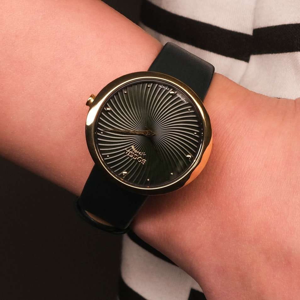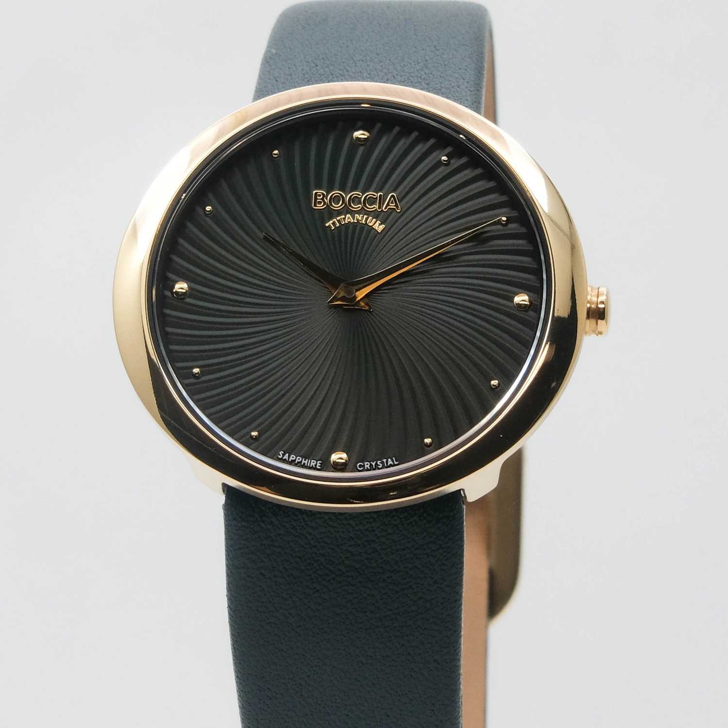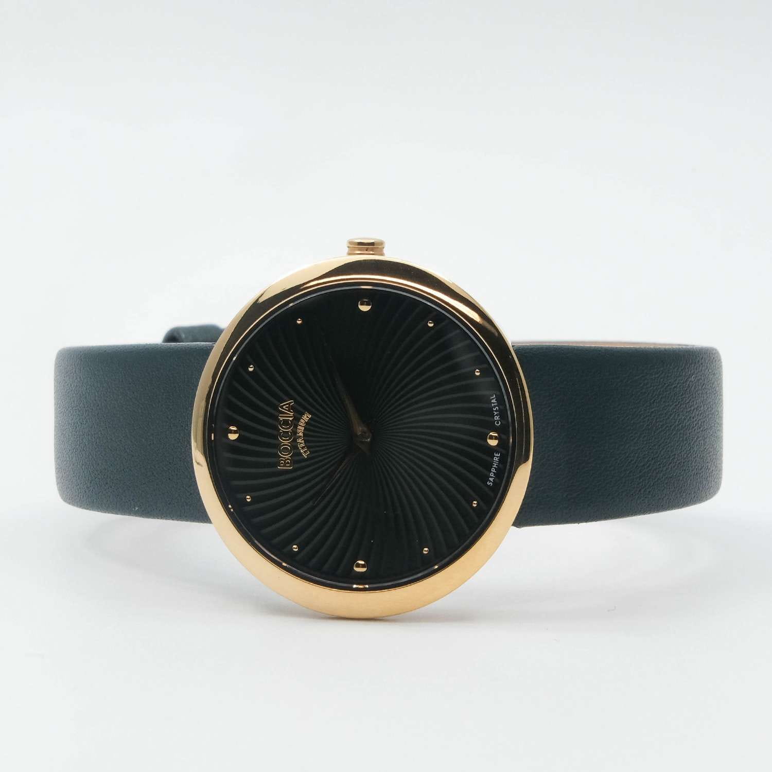Женские часы Boccia Titanium 3364-04 станут прекрасным дополнением вашего стильного образа. Эти часы оснащены надежным кварцевым механизмом Miyota GL22, обеспечивающим точное время. Центральные часовая и минутная стрелки аккуратно выделяются на зеленом гильошированном циферблате, придавая часам элегантный вид. Корпус часов выполнен из суперлегкого титана с PVDPVDУльтратонкое покрытие наносится в технике вакуумного напыления, сочетает в себе нитрид титана особой прочности со слоем золота или оксида хрома. Несёт в себе декоративную или защитную функцию.-покрытием цвета желтого золота, что делает их не только прочными, но и невероятно комфортными в ношении. Овальная форма корпуса размером 30 х 32 мм добавляет изысканности и утонченности. Зеленый кожаный ремешок с классической застежкой гармонично дополняет общий стиль часов. Сапфировое стеклоСапфировое стеклоПрочный и надёжный материал из кристалла сапфира синтетического происхождения, характеризующийся особой твёрдостью и устойчивостью к царапинам и повреждениям., устойчивое к появлению царапин, надежно защищает циферблат, обеспечивая долговечность и сохранение первоначального внешнего вида. Водостойкость уровня WR 50 позволяет не беспокоиться о попадании влаги при мытье рук или в дождливую погоду.