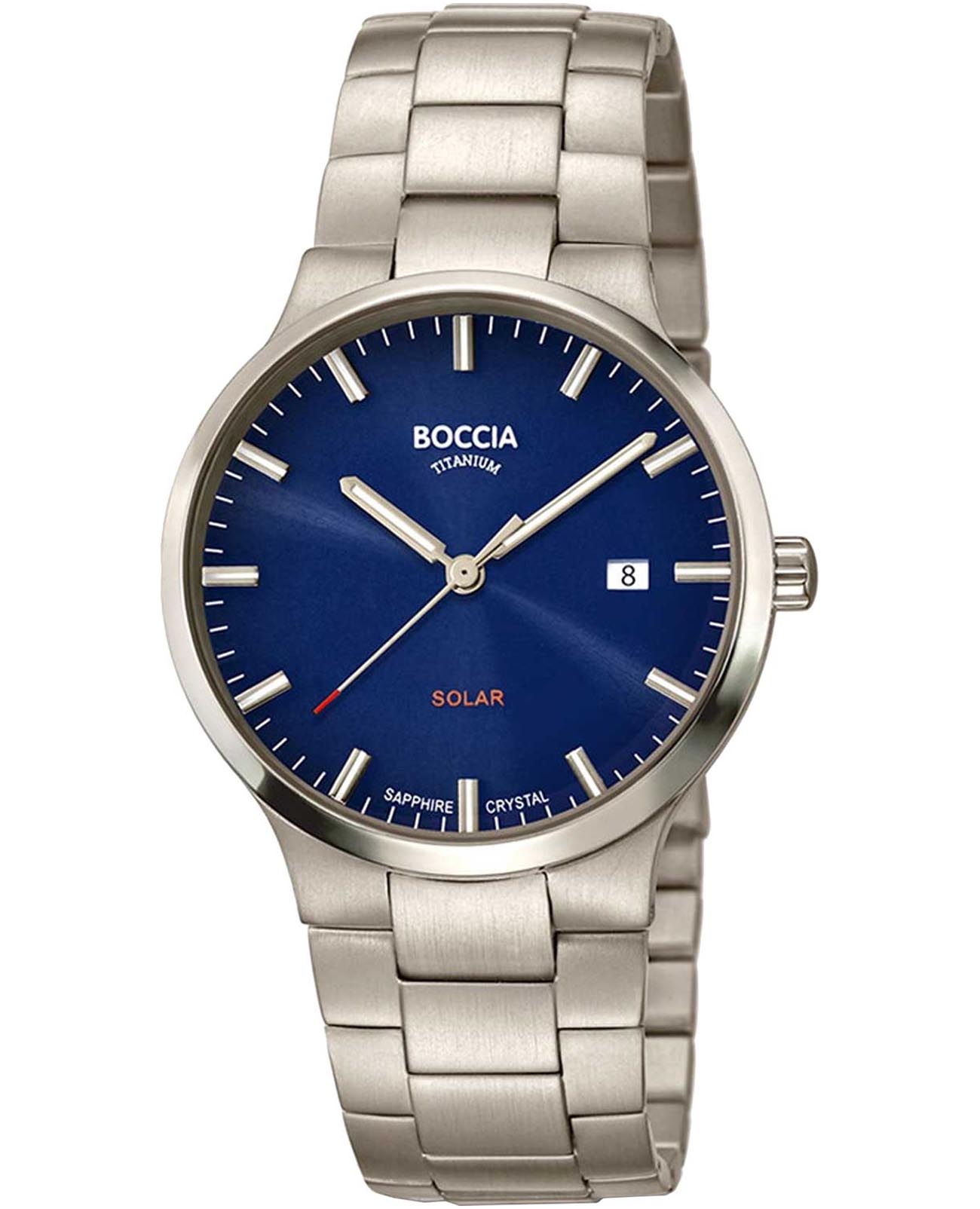 Мужские наручные часы Boccia Titanium 3652-02 с солнечной батареей. Сапфировое стеклоСапфировое стеклоПрочный и надёжный материал из кристалла сапфира синтетического происхождения, характеризующийся особой твёрдостью и устойчивостью к царапинам и повреждениям. устойчивое к мелким механическим повреждениям. Корпус и браслет часов изготовлены из титана. Титановый браслет на раскладной застёжкеРаскладная застёжкаТакой тип застёжки используется только на браслетах из металла. Она никогда не раскрывается полностью, происходит разделение на 2 и более частей. Раскладывающая застёжка снизит вероятность потери часов к минимуму.. Класс водозащиты: 50 метров, позволит защитить корпус от случайных брызг или капель дождя. Стрелки и метки с люминесцентным покрытиемЛюминесцентное покрытиеПозволяет считывать показания времени в темноте. Производители наносят на стрелки, часовые индексы, безель или поверхность циферблата светонакопительный состав, дающий холодное свечение.. Окошки даты находится в положении 3 часа.