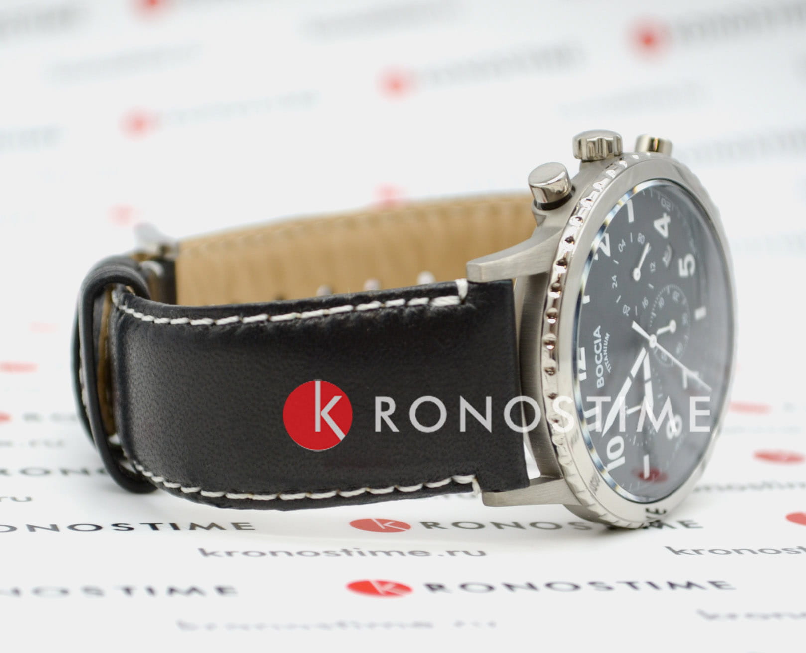 Мужские немецкие титановые часы-хронографХронографФункция позволяет измерять отрезки времени с особой точностью: часы, минуты, секунды. Верным признаком хронографа является наличие на циферблате 3 дополнительных окошек-счётчиков. с секундомеромСекундомерСекундоме́р — прибор, способный измерять интервалы времени с точностью до долей секунды. Boccia Titanium Circle-Oval 3745-01, кварцевый механизм с высокой точностью. Сапфировое стеклоСапфировое стеклоПрочный и надёжный материал из кристалла сапфира синтетического происхождения, характеризующийся особой твёрдостью и устойчивостью к царапинам и повреждениям. устойчивое к появлению царапин, обладающее высокой прозрачностью. Корпус изготовлен из титана. На цифрблате расположены три дополнительных индикатора и окошко даты. Стрелки с люминесцентным покрытиемЛюминесцентное покрытиеПозволяет считывать показания времени в темноте. Производители наносят на стрелки, часовые индексы, безель или поверхность циферблата светонакопительный состав, дающий холодное свечение.. Класс водозащиты: 50 метров, позволит защитить корпус от случайных брызг или капель дождя. Кожаный браслет на стандартной застежке.