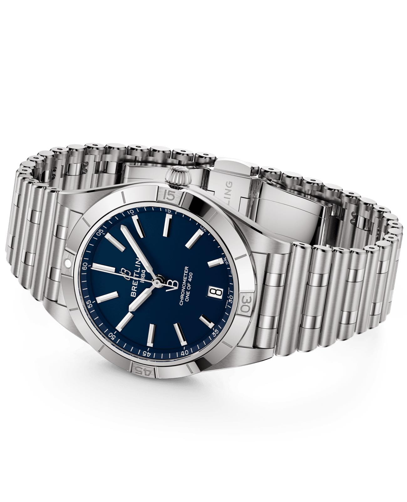 Женские швейцарские часы Breitling Chronomat Automatic 36 Victoria Beckham A103801A1C1A1 с надёжным автоматическим механизмом, выпущенные лимитированной серией всего из 1500 экземпляров в сотрудничестве с модным домом Victoria Beckham. Сапфировое стеклоСапфировое стеклоПрочный и надёжный материал из кристалла сапфира синтетического происхождения, характеризующийся особой твёрдостью и устойчивостью к царапинам и повреждениям. устойчивое к мелким механическим повреждениям. Корпус и браслет часов изготовлены из нержавеющей стали. Стальной браслет на застёжке-бабочке с кнопкамиЗастёжка "бабочка"Такой вид застёжки дополняется предохранителями, помогающими избежать случайного раскрытия браслета. Обладают изящным исполнением. . Стрелки и метки с люминесцентным покрытиемЛюминесцентное покрытиеПозволяет считывать показания времени в темноте. Производители наносят на стрелки, часовые индексы, безель или поверхность циферблата светонакопительный состав, дающий холодное свечение.. Класс водозащиты: 100 метров, позволит плавать, нырять и заниматься другими водными видами спорта. Окошко даты находится в положении 6 часов.