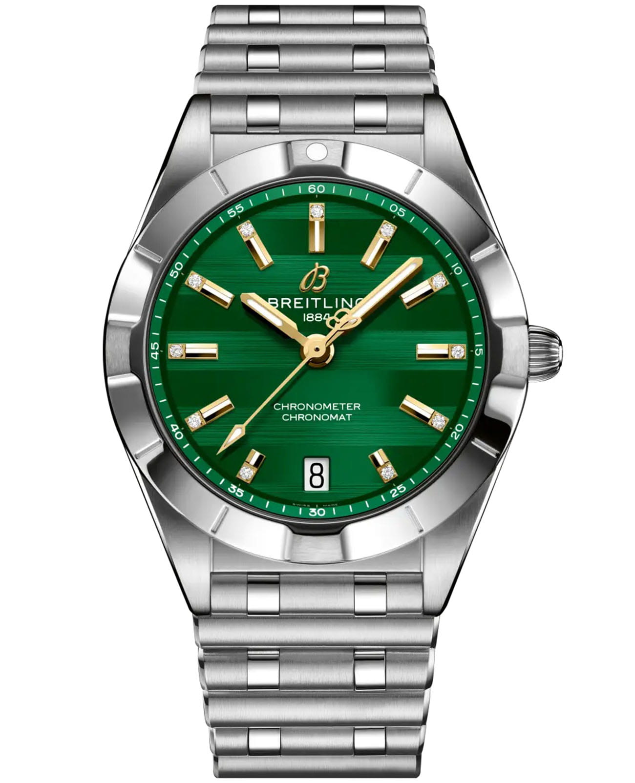 Женские кварцевые часы Breitling Chronomat 32 A773107A1L1A1 — это изысканный аксессуар, сочетающий в себе классический дизайн и современные технологии. Модель выполнена из нержавеющей стали с диаметром корпуса 32 мм и толщиной 8,54 мм, что делает её утончённой и лаконичной. Циферблат зелёного цвета дополнен 11 бриллиантами круглой огранки, придающими модели роскошный внешний вид. Защиту механизма обеспечивает сапфировое стеклоСапфировое стеклоПрочный и надёжный материал из кристалла сапфира синтетического происхождения, характеризующийся особой твёрдостью и устойчивостью к царапинам и повреждениям. с антибликовым покрытиемАнтибликовое покрытиеСлой оксида металла в 0,13-0,3 микрон, благодаря которому стекло часов не бликует и не отражает свет. Антибликовое покрытие уменьшает отражение света в 10 раз, обеспечивая отличную читаемость показателей циферблата., устойчивым к повреждениям. Браслет из нержавеющей стали оснащён застёжкой «бабочка» с кнопкамиЗастёжка "бабочка"Такой вид застёжки дополняется предохранителями, помогающими избежать случайного раскрытия браслета. Обладают изящным исполнением. , обеспечивающей комфорт и надёжную фиксацию на запястье. Часы оснащены кварцевым механизмом Breitling 77, обеспечивающим точную работу и минимальное обслуживание. Водонепроницаемость позволяет использовать модель при плавании и других водных активностях без глубокого погружения. На задней крышке выгравирован логотип спортивной команды, которой посвящена модель, и надпись «Один из 75». Это лимитированная серия, выпущенная всего 75 экземпляров, что подчёркивает её уникальность. Гарантия 2 года подтверждает качество и долговечность изделия. Эти часы станут универсальным аксессуаром для тех, кто ценит сочетание стиля, функциональности и швейцарского мастерства — идеальный выбор для повседневной носки и торжественных случаев.