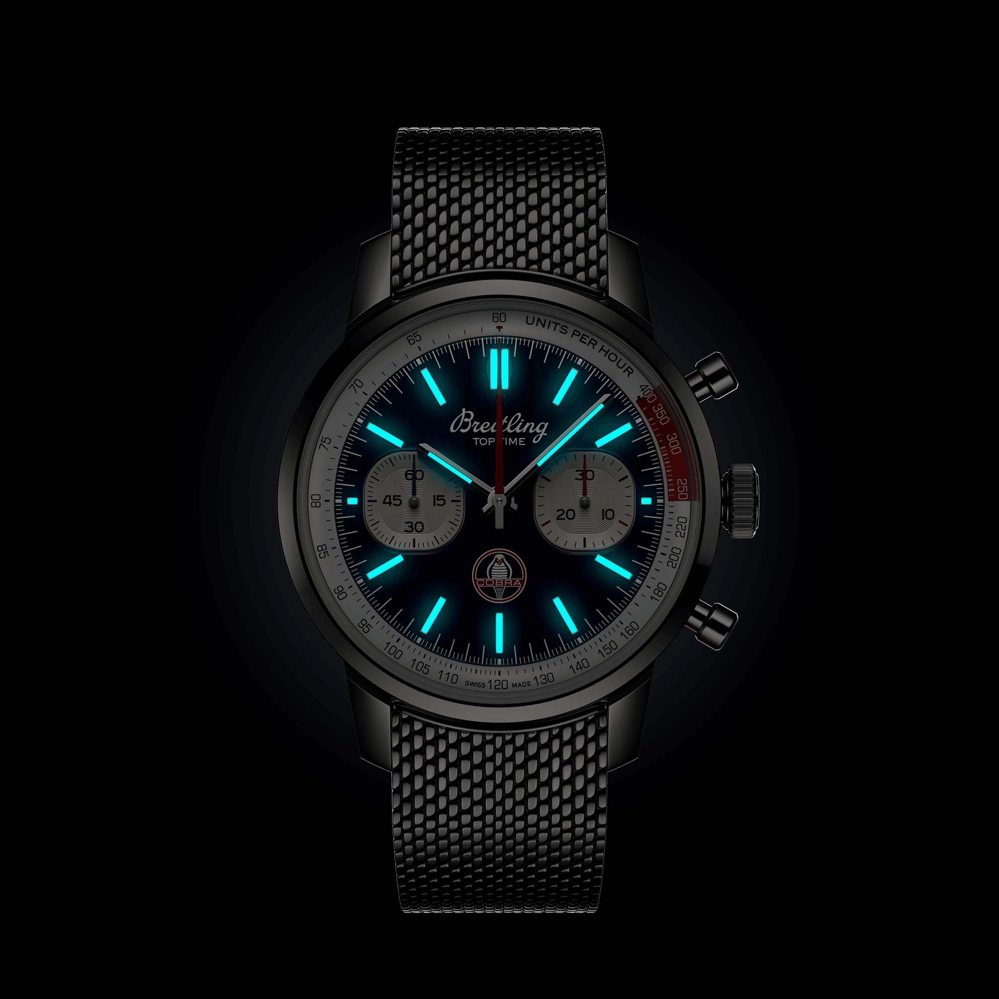 Мужские швейцарские часы-хронографХронографФункция позволяет измерять отрезки времени с особой точностью: часы, минуты, секунды. Верным признаком хронографа является наличие на циферблате 3 дополнительных окошек-счётчиков. с тахиметромТахиметрРазмеченная шкала, располагается на ободке или безеле часов. Тахиметр позволяет рассчитать скорость на определённом участке пути, расстояние измеряется в километрах или милях. Breitling Top Time B01 Shelby Cobra AB01763A1C1A1, механический механизм (автоматический калибр) с высокой точностью. Сапфировое стеклоСапфировое стеклоПрочный и надёжный материал из кристалла сапфира синтетического происхождения, характеризующийся особой твёрдостью и устойчивостью к царапинам и повреждениям. устойчивое к появлению царапин, обладающее высокой прозрачностью. Класс водозащиты: 100 метров, позволит плавать, нырять и заниматься другими водными видами спорта. Корпус часов изготовлен из стали. Стрелки и метки с люминесцентным покрытиемЛюминесцентное покрытиеПозволяет считывать показания времени в темноте. Производители наносят на стрелки, часовые индексы, безель или поверхность циферблата светонакопительный состав, дающий холодное свечение.. Стальной браслет с застёжкой-бабочкой с кнопкамиЗастёжка "бабочка"Такой вид застёжки дополняется предохранителями, помогающими избежать случайного раскрытия браслета. Обладают изящным исполнением. . Неподвижный безельБезельВнешний ободок, закрепляющий стекло. В спортивных часах так называется поворотное кольцо с делениями на циферблате, выполняет роль таймера – замеряет отрезки времени на шкале. Неподвижный безель – элемент декора. Однонаправленно вращающийся безель на дайверских часах позволяет фиксировать моменты погружения и выныривания на поверхность..