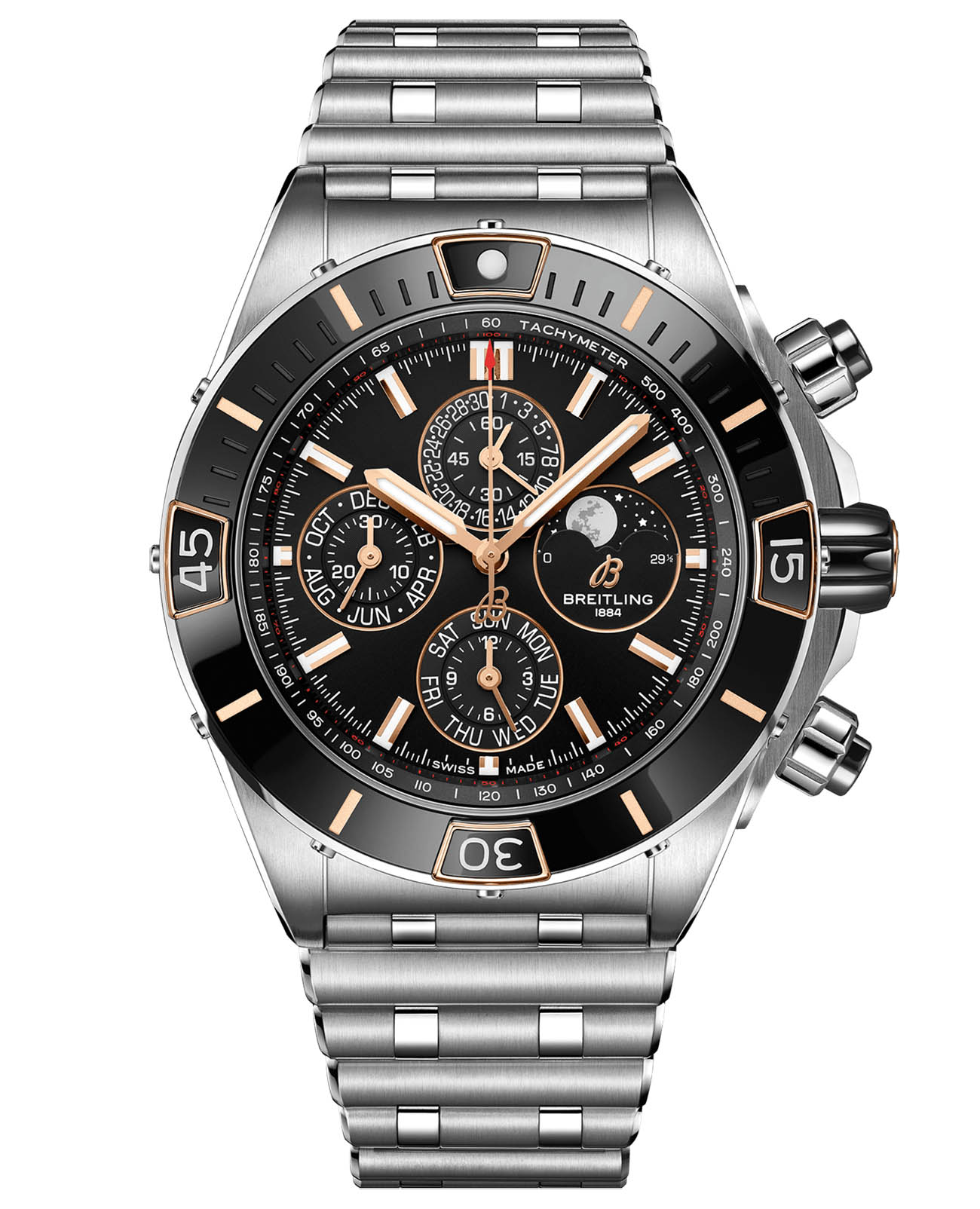 «Реактивные» часы Breitling с четырехлетним календарем на все случаи жизни. Часы Super Chronomat созданы по мотивам оригинальной модели Chronomat 80-х годов, которая была разработана компанией Breitling для асов пилотажной эскадрильи. Обладающие наиболее смелым дизайном из всех моделей коллекции Chronomat, часы Super Chronomat отличаются кармической инкрустацией на безеле, кнопках хронографа и заводной головке.