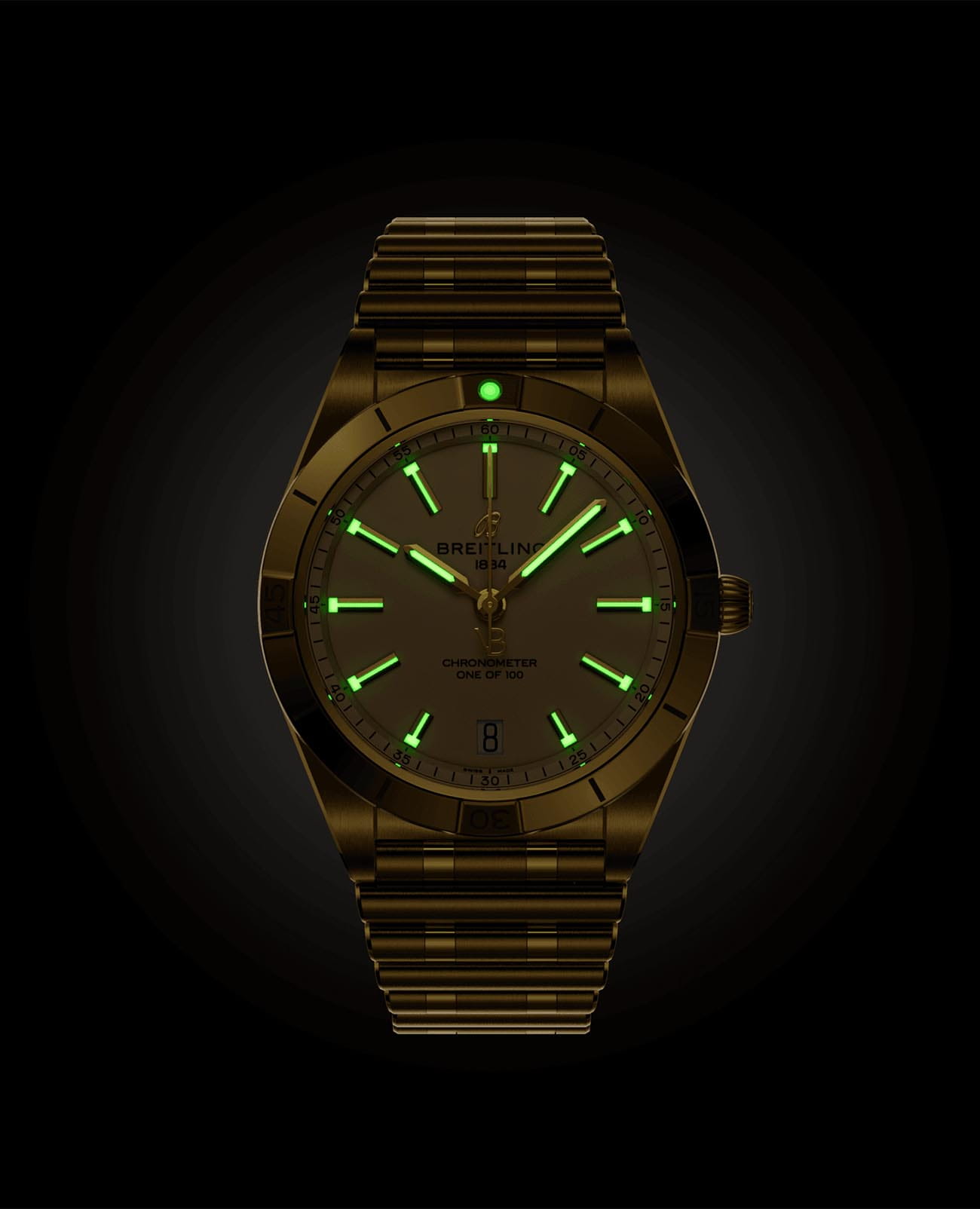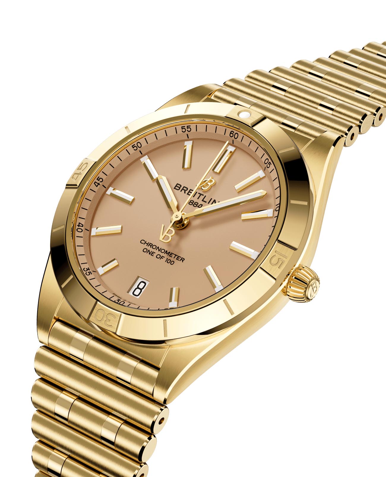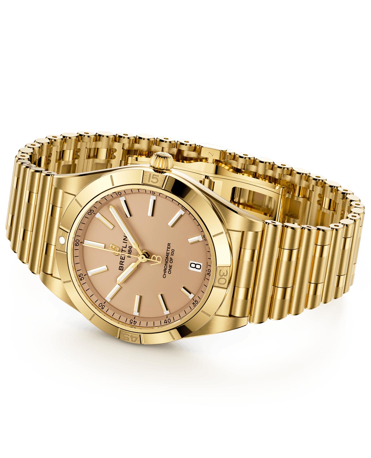 Женские швейцарские часы Breitling Chronomat Automatic 36 Victoria Beckham K103801A1A1K1 с надёжным автоматическим механизмом, выпущенные лимитированной серией всего из 1500 экземпляров в сотрудничестве с модным домом Victoria Beckham. Сапфировое стеклоСапфировое стеклоПрочный и надёжный материал из кристалла сапфира синтетического происхождения, характеризующийся особой твёрдостью и устойчивостью к царапинам и повреждениям. устойчивое к мелким механическим повреждениям. Корпус и браслет часов изготовлены из желтого 18-каратного золота18-каратное золотоОбозначение по каратной системе пробирования, оно показывает, сколько драгоценного металла содержится в изделии. 18 карат - в составе 75% чистого золота, соответствует 750 пробе.