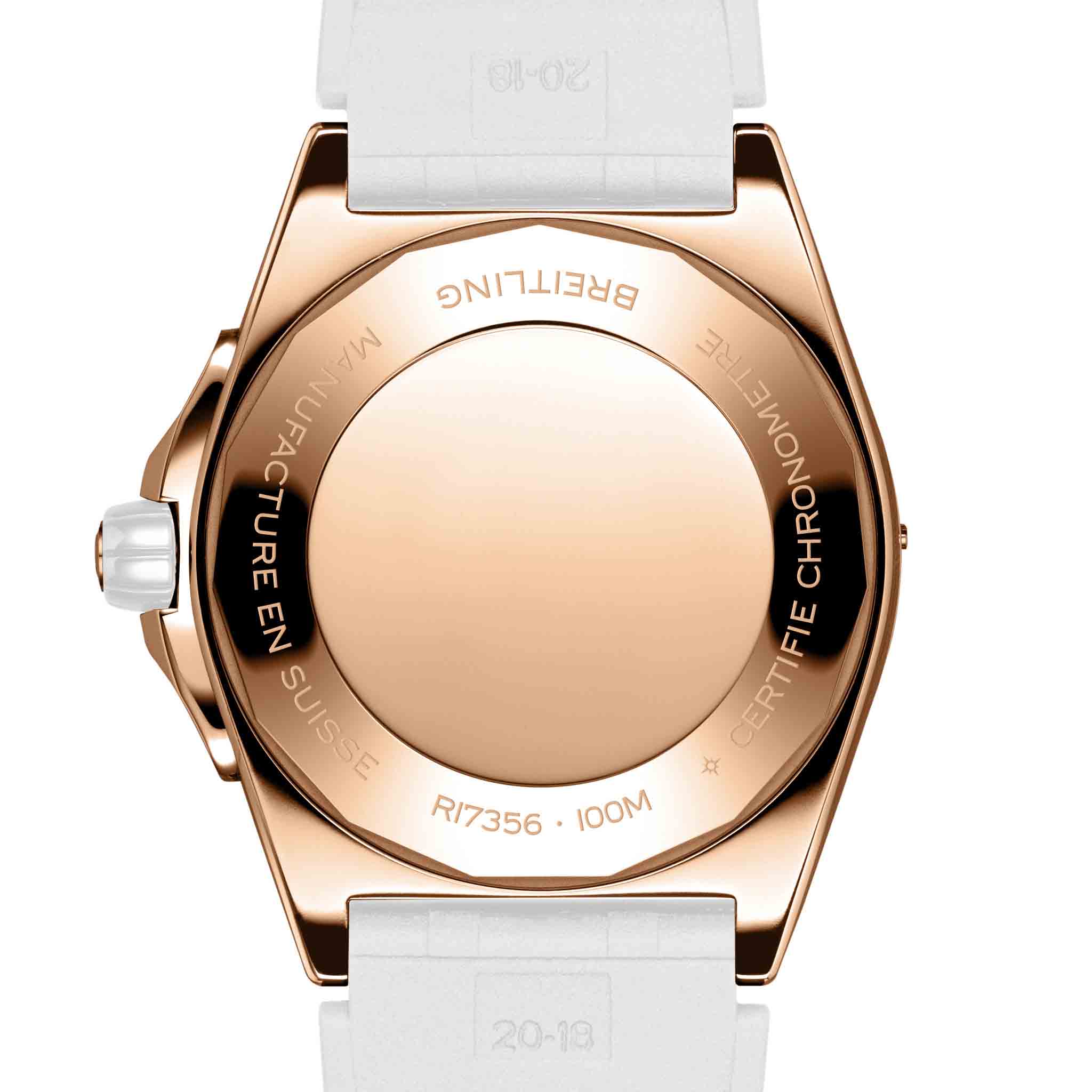 Женские швейцарские часы Breitling Super Chronomat Automatic 38 Origins R17356531G1S1, механический механизм (автоматический калибр) с высокой точностью. Сапфировое стеклоСапфировое стеклоПрочный и надёжный материал из кристалла сапфира синтетического происхождения, характеризующийся особой твёрдостью и устойчивостью к царапинам и повреждениям. устойчивое к появлению царапин, обладающее высокой прозрачностью. Класс водозащиты: 100 метров, позволит плавать, нырять и заниматься другими водными видами спорта. Корпус часов изготовлен из золота. Силиконовый ремешок с раскладной застёжкойРаскладная застёжкаТакой тип застёжки используется только на браслетах из металла. Она никогда не раскрывается полностью, происходит разделение на 2 и более частей. Раскладывающая застёжка снизит вероятность потери часов к минимуму.. Отличить Super от остальных моделей семейства Chronomat можно по керамическим язычкам и заводной головке. Помимо улучшенного внешнего вида, Automatic 38 также имеет сияющую сторону. БезельБезельВнешний ободок, закрепляющий стекло. В спортивных часах так называется поворотное кольцо с делениями на циферблате, выполняет роль таймера – замеряет отрезки времени на шкале. Неподвижный безель – элемент декора. Однонаправленно вращающийся безель на дайверских часах позволяет фиксировать моменты погружения и выныривания на поверхность. из золота украшен крупными бриллиантами, выращенными в лабораторных условиях. Цвета циферблата добавляют как раз нужное количество привлекательности для глаз. Окошко даты находится в положении 6 часов. Стрелки и метки с люминесцентным покрытиемЛюминесцентное покрытиеПозволяет считывать показания времени в темноте. Производители наносят на стрелки, часовые индексы, безель или поверхность циферблата светонакопительный состав, дающий холодное свечение.. Breitling стимулирует перемены, создавая красивые продукты и впечатления с использованием лучших материалов, более совершенного производства и лучшей упаковки. Super Chronomat 38 Origins является важной вехой на этом пути. Часы украшены мелким золотом и бриллиантами, выращенными в лабораторных условиях. Эти драгоценные материалы можно проследить от их происхождения до часов на вашем запястье — и подробно просмотреть в отчете о происхождении, который прилагается к вашим часам в NFT, поддерживаемом блокчейном.