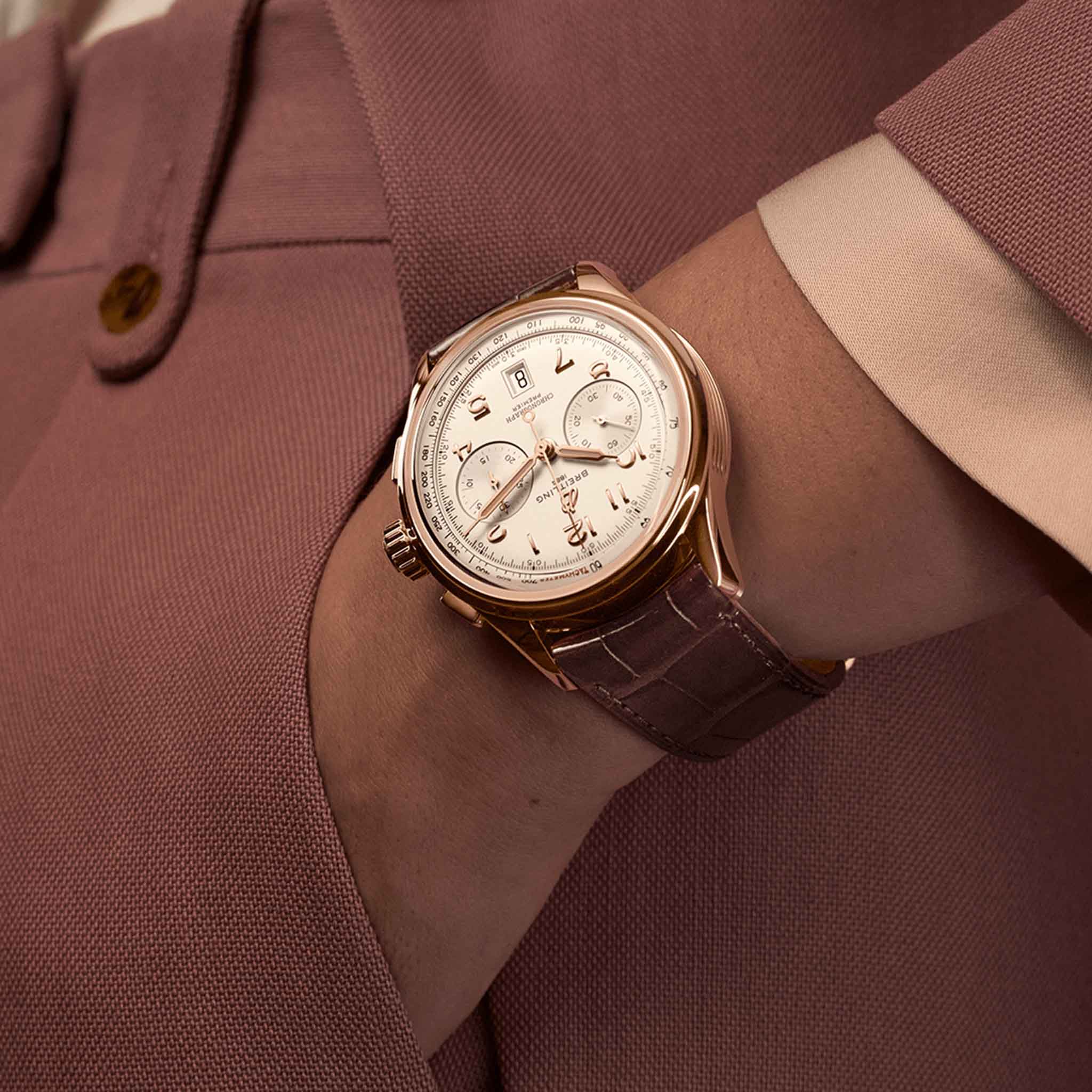 Мужские швейцарские часы-хронографХронографФункция позволяет измерять отрезки времени с особой точностью: часы, минуты, секунды. Верным признаком хронографа является наличие на циферблате 3 дополнительных окошек-счётчиков. с тахиметромТахиметрРазмеченная шкала, располагается на ободке или безеле часов. Тахиметр позволяет рассчитать скорость на определённом участке пути, расстояние измеряется в километрах или милях. Breitling Premier B01 Chronograph 42 RB0145371G1P1, механический механизм (автоматический калибр) с высокой точностью. Сапфировое стеклоСапфировое стеклоПрочный и надёжный материал из кристалла сапфира синтетического происхождения, характеризующийся особой твёрдостью и устойчивостью к царапинам и повреждениям. устойчивое к появлению царапин, обладающее высокой прозрачностью. Класс водозащиты: 100 метров, позволит плавать, нырять и заниматься другими водными видами спорта. Корпус часов изготовлен из 18-каратного золота18-каратное золотоОбозначение по каратной системе пробирования, оно показывает, сколько драгоценного металла содержится в изделии. 18 карат - в составе 75% чистого золота, соответствует 750 пробе.
