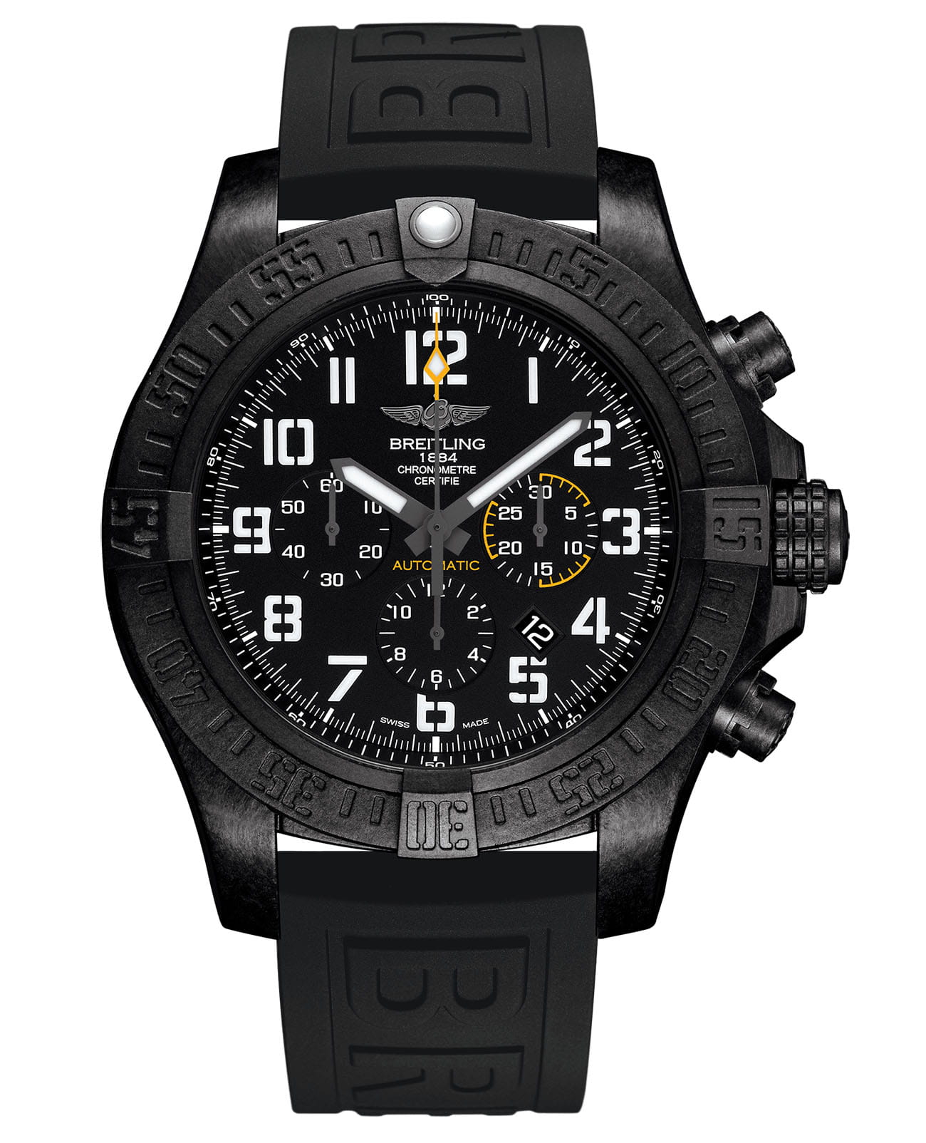 Выдающийся диаметр 50 мм, ультра-стойкий, ультра-легкий корпус из Breitlight®, мануфактурный калибр Breitling 01: модель Avenger Hurricane 12H решительно нацелена на достижение высочайших показателей. Техничный и мощный черный или желтый циферблат отличается своими напоминающими об авиации белыми трафаретными цифрами. Кнопки и головка подзавода имеют поверхность, защищенную от проскальзывания, что обеспечивает оптимальную регулировку, даже в перчатках. Avenger Hurricane: выше превосходства.