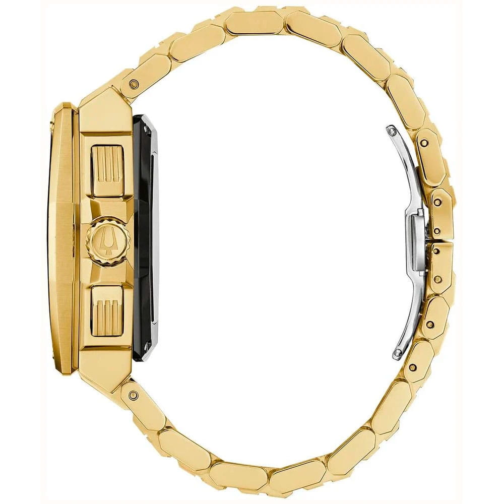 Мужские кварцевые часы-хронографХронографФункция позволяет измерять отрезки времени с особой точностью: часы, минуты, секунды. Верным признаком хронографа является наличие на циферблате 3 дополнительных окошек-счётчиков. с секундомеромСекундомерСекундоме́р — прибор, способный измерять интервалы времени с точностью до долей секунды. Bulova Precisionist X Special Edition 98B429 – отражающий идеальное сочетание современного дизайна, надёжности и функциональности. Сверхточный кварцевый хронограф. Частота колебаний механизма составляет 262 кГц , что превышает мировой стандарт в 8 раз. Корпус из нержавеющей стали с PVD-покрытиемPVDУльтратонкое покрытие наносится в технике вакуумного напыления, сочетает в себе нитрид титана особой прочности со слоем золота или оксида хрома. Несёт в себе декоративную или защитную функцию. золотистого цвета, диаметром 44.5 мм идеально сбалансирован и надежен. Сапфировое стеклоСапфировое стеклоПрочный и надёжный материал из кристалла сапфира синтетического происхождения, характеризующийся особой твёрдостью и устойчивостью к царапинам и повреждениям. защищает циферблат от царапин и устойчивое к механическим повреждениям. На черном циферблате есть окошко календаря. Стальной браслет на застёжке-бабочке с кнопкамиЗастёжка "бабочка"Такой вид застёжки дополняется предохранителями, помогающими избежать случайного раскрытия браслета. Обладают изящным исполнением. обеспечивает комфортное ношение. БезельБезельВнешний ободок, закрепляющий стекло. В спортивных часах так называется поворотное кольцо с делениями на циферблате, выполняет роль таймера – замеряет отрезки времени на шкале. Неподвижный безель – элемент декора. Однонаправленно вращающийся безель на дайверских часах позволяет фиксировать моменты погружения и выныривания на поверхность. с вставкой из серой дамасской стали. Водозащита 50 метров позволит защитить корпус от случайных брызг или капель дождя. Стрелки и метки с люминесцентным покрытиемЛюминесцентное покрытиеПозволяет считывать показания времени в темноте. Производители наносят на стрелки, часовые индексы, безель или поверхность циферблата светонакопительный состав, дающий холодное свечение. позволяющие легко определять время даже в темноте. Эта модель – отличный выбор для тех, кто ищет сочетание стиля, качества и функциональности. Часы станут не только полезным аксессуаром, но и выразительным элементом вашего имиджа.