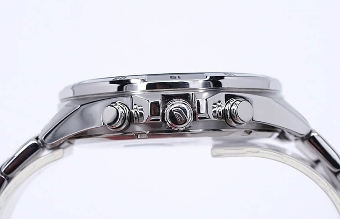 Спортивный аксессуар отличается динамичным циферблатом с большим количеством деталей, золотистые элементы отлично выделяются на тёмном фоне. Ударопрочный корпусУдаропрочный корпусМеханизм заключён в корпус, выполненный из современных материалов, устойчивых к ударам, механическим повреждениям и падению с высоты: инновационный пластик, карбон, нержавеющая сталь, титан. и браслет выполнены из нержавеющей стали 316L, характеризующейся долговечностью. Точность хода кварцевого механизма составляет +/- 30 секунд в месяц. Люминесцентная подсветкаЛюминесцентное покрытиеПозволяет считывать показания времени в темноте. Производители наносят на стрелки, часовые индексы, безель или поверхность циферблата светонакопительный состав, дающий холодное свечение.. Минеральное стекло. Завинчивающаяся задняя крышка. Водостойкость 10 бар. ХронографХронографФункция позволяет измерять отрезки времени с особой точностью: часы, минуты, секунды. Верным признаком хронографа является наличие на циферблате 3 дополнительных окошек-счётчиков., секундомер, календарь. Габариты: 53,5 x 48,7 x 12,6 мм.