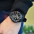 Спортивный аксессуар отличается динамичным циферблатом с большим количеством деталей, золотистые элементы отлично выделяются на тёмном фоне. Ударопрочный корпусУдаропрочный корпусМеханизм заключён в корпус, выполненный из современных материалов, устойчивых к ударам, механическим повреждениям и падению с высоты: инновационный пластик, карбон, нержавеющая сталь, титан. выполнен из нержавеющей стали 316L, характеризующейся долговечностью. Точность хода кварцевого механизма составляет +/- 30 секунд в месяц. Люминесцентная подсветкаЛюминесцентное покрытиеПозволяет считывать показания времени в темноте. Производители наносят на стрелки, часовые индексы, безель или поверхность циферблата светонакопительный состав, дающий холодное свечение.. Минеральное стекло. Защитное IP-покрытиеIP-покрытиеМетод ионного напыления. Демонстрирует повышенную устойчивость к истиранию, окислению и химическим веществам. Под воздействием высокого давления и температуры около 1500°C молекулы металла надёжно соединяются с частицами корпуса часов.. Завинчивающаяся задняя крышка. Водостойкость 10 бар. Ремешок из полимерного пластика. ХронографХронографФункция позволяет измерять отрезки времени с особой точностью: часы, минуты, секунды. Верным признаком хронографа является наличие на циферблате 3 дополнительных окошек-счётчиков., секундомер, календарь. Габариты: 53,5 x 48,7 x 12,6 мм.