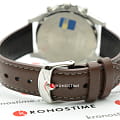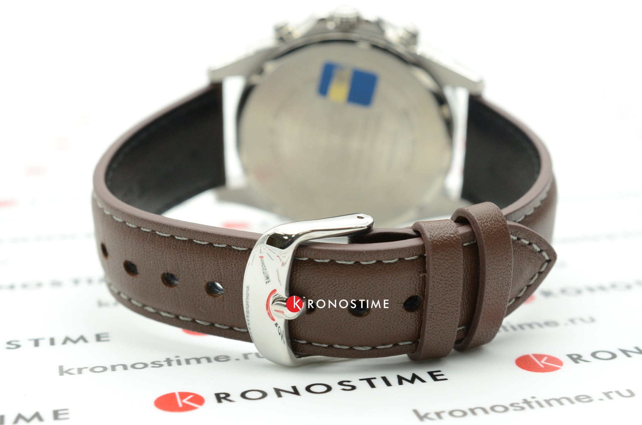 Для модели было выбрано тёмное цветовое решение, циферблат с необычным расположением счётчиков хронографаХронографФункция позволяет измерять отрезки времени с особой точностью: часы, минуты, секунды. Верным признаком хронографа является наличие на циферблате 3 дополнительных окошек-счётчиков. и крупной индикацией времени выглядит действительно стильно. Наручные часы обеспечиваются питанием благодаря технологии , что весьма удобно и экологично. Точностью хода кварцевого механизма составляет +/- 15 секунд в месяц. Стекло из сапфира. Люминесцентная подсветкаЛюминесцентное покрытиеПозволяет считывать показания времени в темноте. Производители наносят на стрелки, часовые индексы, безель или поверхность циферблата светонакопительный состав, дающий холодное свечение.. Водозащита 10 бар. Кофейного цвета ремешок из натуральной кожи. Секундомер, календарь. Габариты: 49,5 x 44,2 x 11,6 мм.