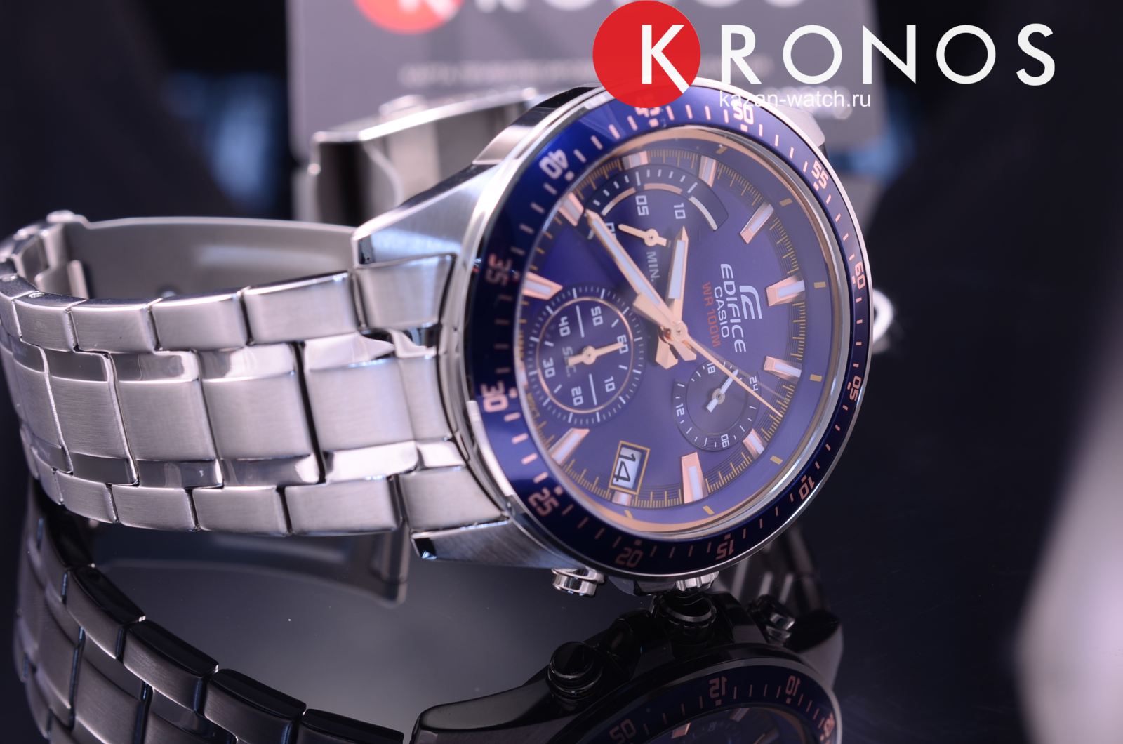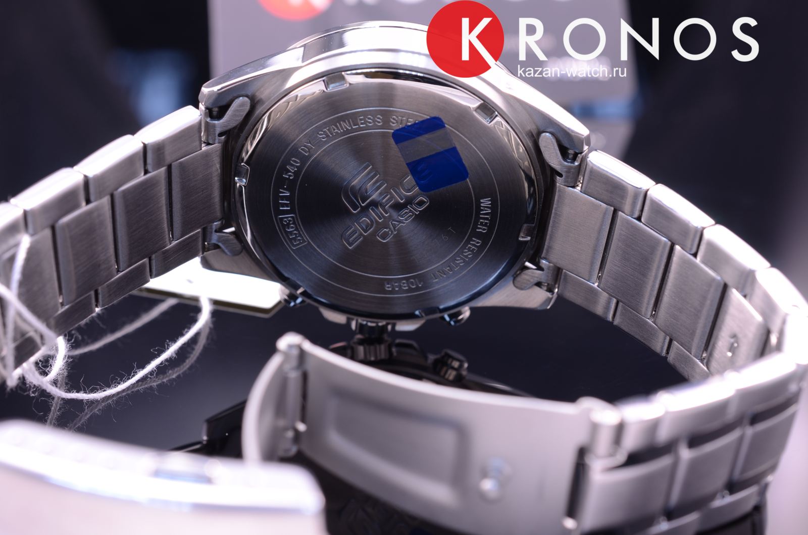 Мужские часы-хронографХронографФункция позволяет измерять отрезки времени с особой точностью: часы, минуты, секунды. Верным признаком хронографа является наличие на циферблате 3 дополнительных окошек-счётчиков. Casio Edifice EFV-540D-2A, кварцевый механизм с высокой точностью. Минеральное стеклоМинеральное стеклоМинеральное стекло представляет собой искусственно выращенный минерал кварца. Такое стекло отличается особой устойчивостью к повреждениям и царапинам. Уступает по некоторым качествам сапфировому стеклу. устойчивое к появлению царапин, обладающее высокой прозрачностью. СекундомерСекундомерСекундоме́р — прибор, способный измерять интервалы времени с точностью до долей секунды. с точностью показаний 1/10с и временем измерения 1ч. Корпус изготовлен из нержавеющей стали. БезельБезельВнешний ободок, закрепляющий стекло. В спортивных часах так называется поворотное кольцо с делениями на циферблате, выполняет роль таймера – замеряет отрезки времени на шкале. Неподвижный безель – элемент декора. Однонаправленно вращающийся безель на дайверских часах позволяет фиксировать моменты погружения и выныривания на поверхность. изготовлен из стали с IP-покрытиемIP-покрытиеМетод ионного напыления. Демонстрирует повышенную устойчивость к истиранию, окислению и химическим веществам. Под воздействием высокого давления и температуры около 1500°C молекулы металла надёжно соединяются с частицами корпуса часов.. Светонакопительное покрытие NeobriteПодсветка NeobriteИспользование светонакопительных составов на основе сульфида цинка или алюмината стронция, яркий свет можно наблюдать на протяжении 6-10 часов после «зарядки» часов около источника света. продолжает светиться в темноте даже после непродолжительного пребывания на свету. Окошко даты находится в положении 4 часов. Класс водозащиты: 100 метров, позволит плавать, нырять и заниматься другими водными видами спорта. Заводная головка с защитой. Кожаный ремешок на стандартной застежке. Стальной браслет на раскладной застёжкеРаскладная застёжкаТакой тип застёжки используется только на браслетах из металла. Она никогда не раскрывается полностью, происходит разделение на 2 и более частей. Раскладывающая застёжка снизит вероятность потери часов к минимуму..