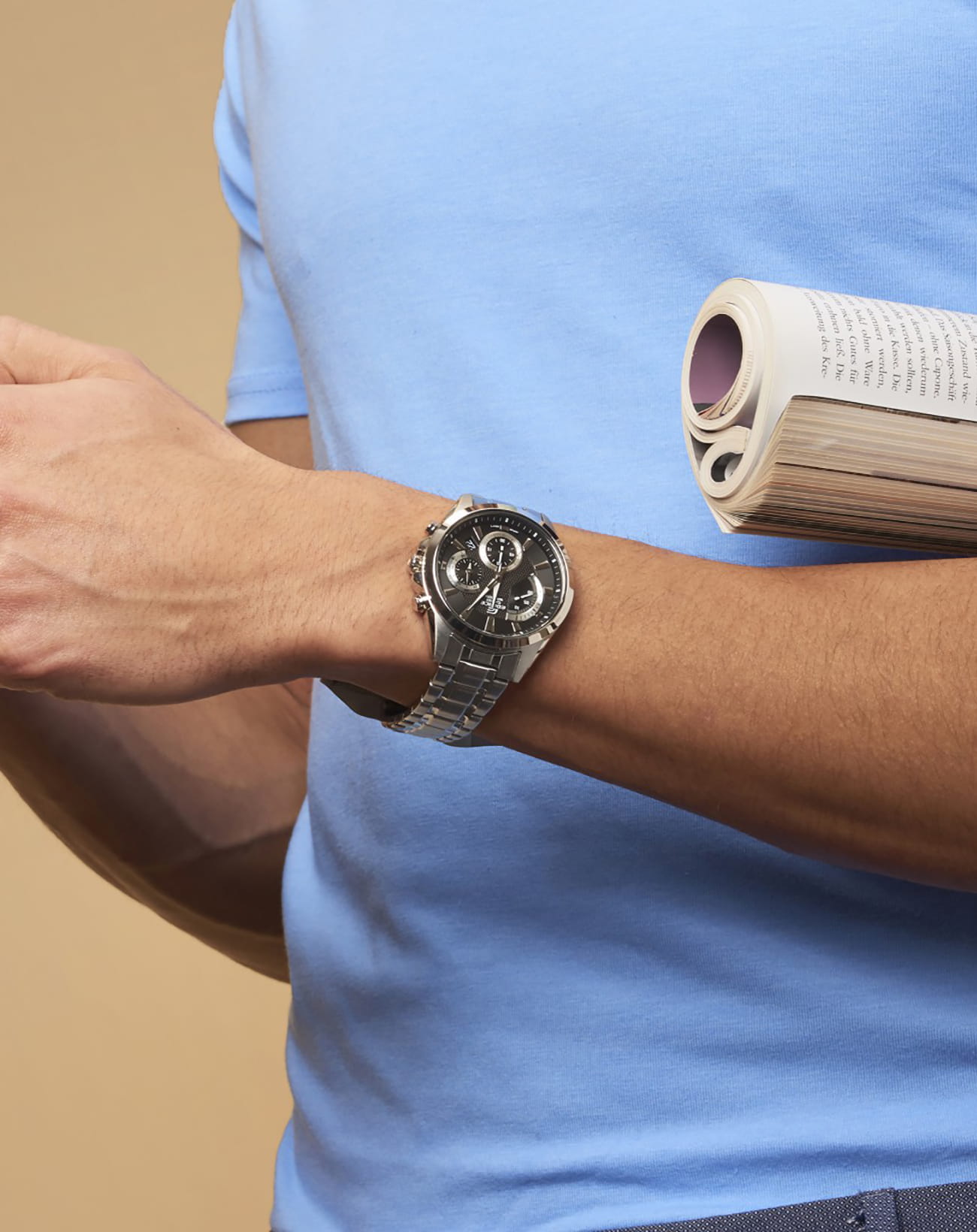 Кварцевый хронографХронографФункция позволяет измерять отрезки времени с особой точностью: часы, минуты, секунды. Верным признаком хронографа является наличие на циферблате 3 дополнительных окошек-счётчиков. понравится любителям активного образа жизни, динамичный дизайн модели станет отображением вашей жизненной позиции и стремления к победам. Чёрный циферблат с узором дополнен миниатюрными счётчиками, отличающимися оригинальным исполнением и расположением. Минеральное стекло устойчиво к царапинам. Срок службы батарейки - 3 года. Люминесцентная подсветкаЛюминесцентное покрытиеПозволяет считывать показания времени в темноте. Производители наносят на стрелки, часовые индексы, безель или поверхность циферблата светонакопительный состав, дающий холодное свечение.. Водонепроницаемость до 10 бар, чему дополнительно способствует закручивающаяся крышка. Секундомер, отображение даты. Габариты: 51 x 43,8 x 12,4 мм.