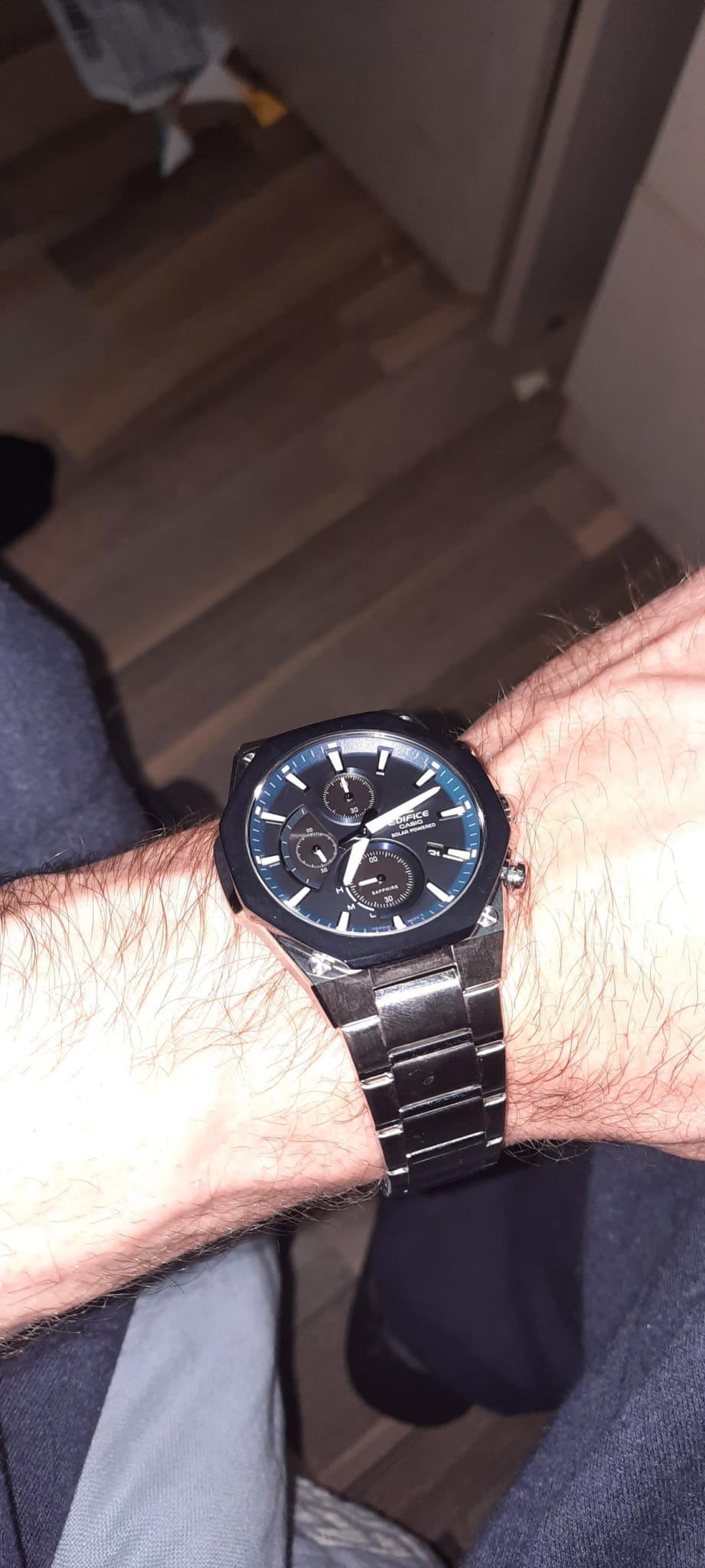 Модель Casio Edifice EFS-S570DB-2AUDF сочетает элегантный дизайн и передовые технологии. Корпус диаметром 44 мм и толщиной 9,7 мм выполнен из нержавеющей стали, что обеспечивает надежность и комфорт при ношении. Плоский восьмиугольный безельБезельВнешний ободок, закрепляющий стекло. В спортивных часах так называется поворотное кольцо с делениями на циферблате, выполняет роль таймера – замеряет отрезки времени на шкале. Неподвижный безель – элемент декора. Однонаправленно вращающийся безель на дайверских часах позволяет фиксировать моменты погружения и выныривания на поверхность. с матовой отделкой подчеркивает спортивный и премиальный стиль.