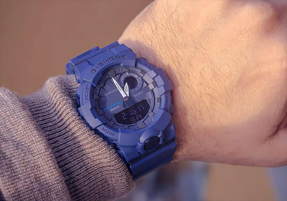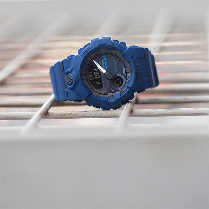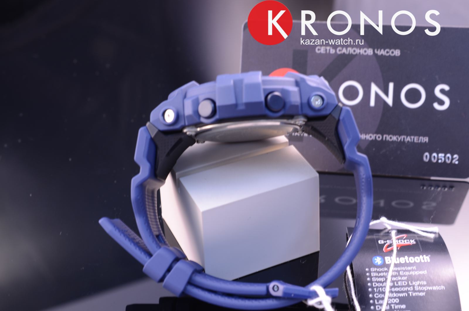 Часы в синем противоударном корпусеУдаропрочный корпусМеханизм заключён в корпус, выполненный из современных материалов, устойчивых к ударам, механическим повреждениям и падению с высоты: инновационный пластик, карбон, нержавеющая сталь, титан. и с минималистичным оформлением циферблата дополнят ваш образ динамичностью и брутальным характером. Модель не лишена функциональности, это первые часы G-Shock, оснащённые трекером активности. Также среди часовых усложнений BluetoothBluetoothСовременная технология, позволяющая синхронизировать часы с телефоном и переносить данные. Часы с Bluetooth расширяют возможности вашего смартфона и делают его использование ещё более удобным., таймер, секундомер, расчёт средней скорости пути, мировое времяМировое время Полезное часовое усложнение, отображающее время в основных городах и известных областях по всему миру, оно связано с часовыми поясами, удобно для путешественников и бизнесменов. , будильник, автоматический календарь. Срок службы батарейки - 2 года. Светодиодная подсветкаСветодиодная подсветкаСветодиодная или LED-подсветка обеспечивает появление яркого холодного свечения за счёт LED-элементов - маленьких лампочек. Они потребляют минимальное количество энергии, чаще всего можно встретить 1 светодиод, в нижней части циферблата. циферблата. Минеральное стекло. Корпус и браслет из полимерного материала. Водостойкость 20 бар. Габариты: 54,1 x 48,6 x 15,5 мм.