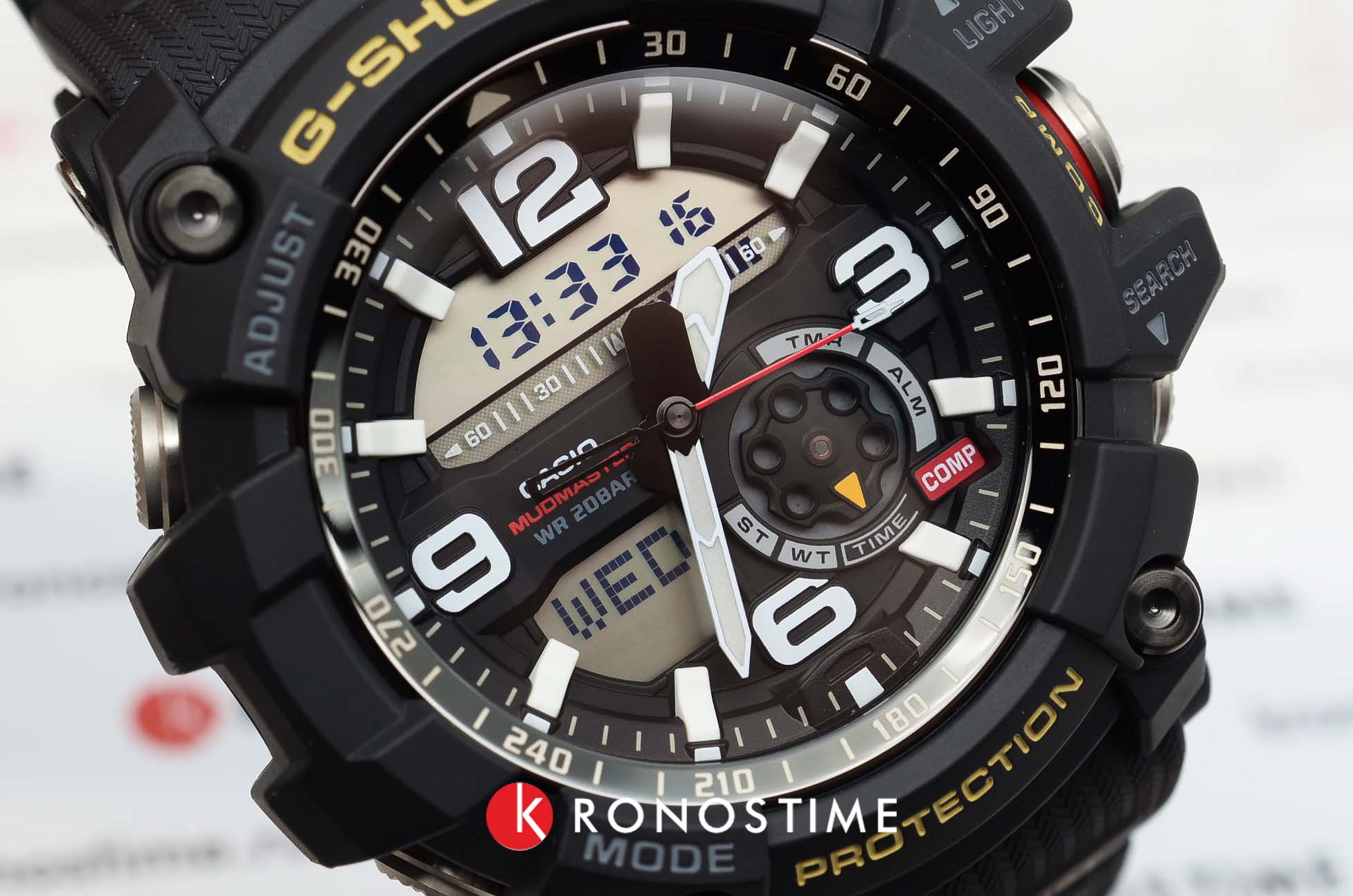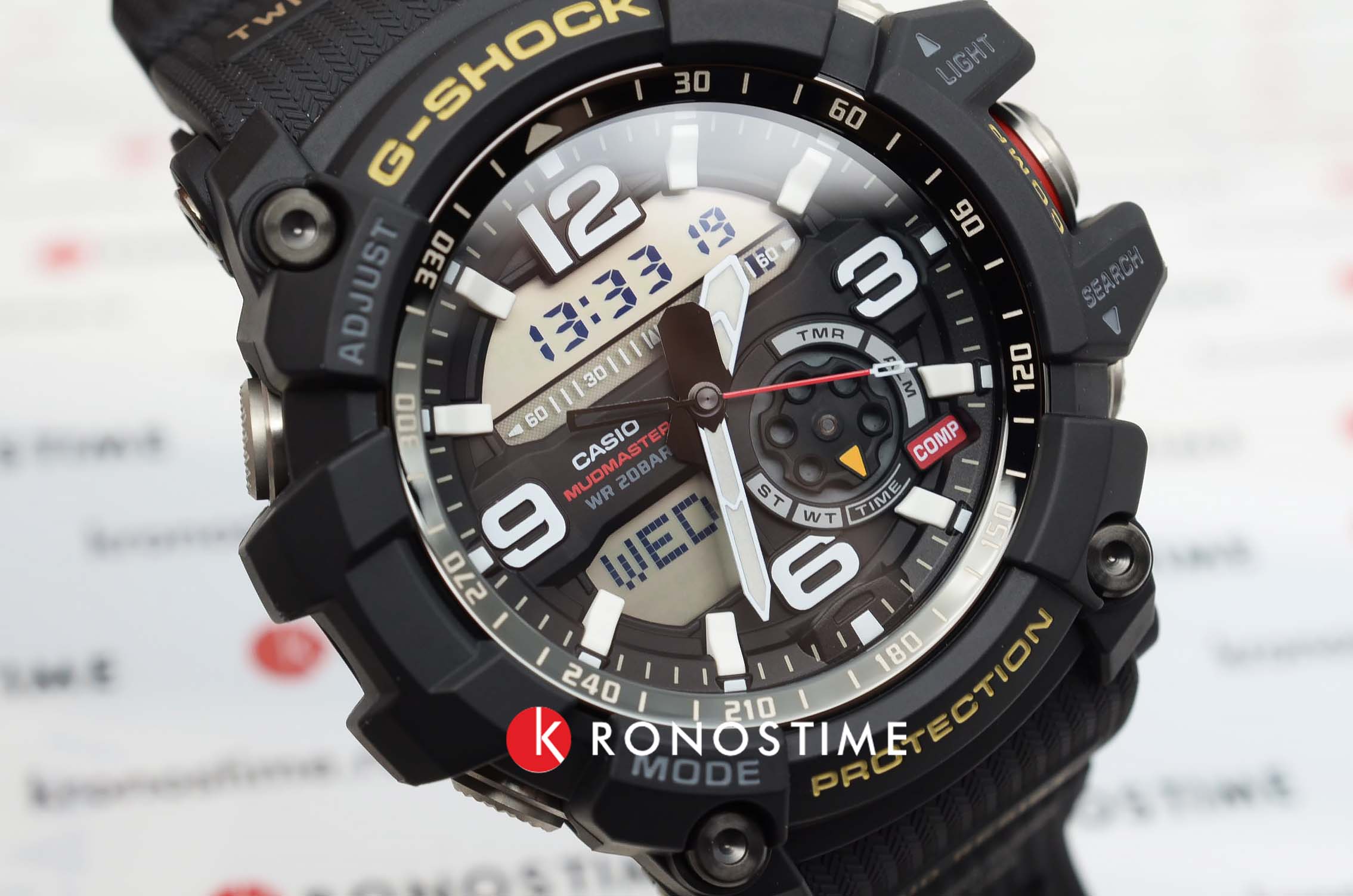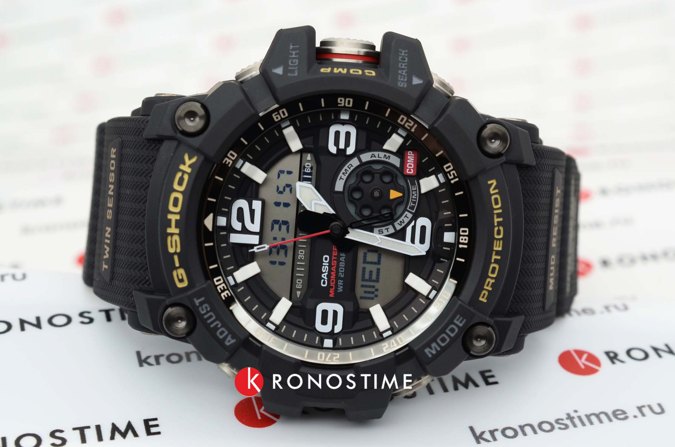 Аксессуар серии Mudmaster отличаются массивным внешним видом, брутальным дизайном и продуманным расположением всех элементов. Тёмное исполнение позволяет экспериментировать с оттенками используемой одежды. Часы отличаются устойчивостью к пыли и грязи, противоударный корпусУдаропрочный корпусМеханизм заключён в корпус, выполненный из современных материалов, устойчивых к ударам, механическим повреждениям и падению с высоты: инновационный пластик, карбон, нержавеющая сталь, титан. защищает японский кварцевый механизм от механических повреждений, вибрации, падения. Батарейка рассчитана на 2 года службы. Водостойкость 20 бар. Автоматическая светодиодная подсветкаСветодиодная подсветкаСветодиодная или LED-подсветка обеспечивает появление яркого холодного свечения за счёт LED-элементов - маленьких лампочек. Они потребляют минимальное количество энергии, чаще всего можно встретить 1 светодиод, в нижней части циферблата.. Закаленное минеральное стеклоМинеральное стеклоМинеральное стекло представляет собой искусственно выращенный минерал кварца. Такое стекло отличается особой устойчивостью к повреждениям и царапинам. Уступает по некоторым качествам сапфировому стеклу.. Светонакопительное покрытие NeobriteПодсветка NeobriteИспользование светонакопительных составов на основе сульфида цинка или алюмината стронция, яркий свет можно наблюдать на протяжении 6-10 часов после «зарядки» часов около источника света.. При движении руки дисплей освещается ярким светом. Включение и выключение звука кнопок. Термометр -10°C /+60°C, цифровой компас, мировое времяМировое время Полезное часовое усложнение, отображающее время в основных городах и известных областях по всему миру, оно связано с часовыми поясами, удобно для путешественников и бизнесменов. , координированное время UTCUTCВсемирное кординационное время, не имеющее привязки к географическому положению Гринвича, основывается на атомном отсчёте времени. Регулировка времени осуществляется более точно, чем устаревшее GMT.