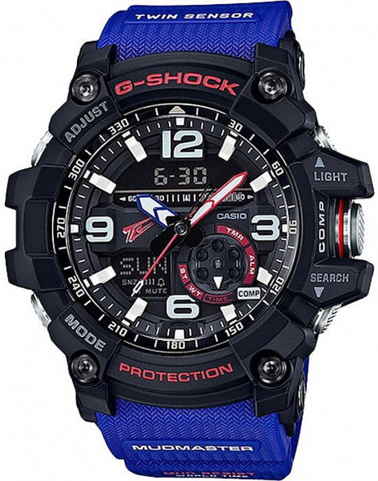 Mudmaster Team Land Cruiser Toyota Auto Body Limited Edition. Лимитированная серия. Индикатор низкого заряда батареи. Противоударный корпус защищает механизм от ударов и вибрации. Защита от попадания внутрь пыли и грязи. Светодиодная автоматическая супер-подсветка. При движении руки дисплей освещается ярким светом. Светонакопительное покрытие необрит продолжает светиться в темноте даже после непродолжительного пребывания на свету. Встроенный цифровой компас. Диапазон измерения от 0° до 359° с точностью 1°. Коррекция магнитного склонения. Встроенный датчик температуры от -10° до +60°С с точностью 0,1°C. Мировое время – 48 городов (31 часовой пояс), всемирное координированное время (UTC). Функция включения/отключения летнего времени. 12-ти и 24-х часовой формат времени. Секундомер с точностью показаний 1/100с и временем измерения 24ч. Сплит-хронограф. Таймер обратного отсчета от 1с до 1ч. Функция отключения/включения звука. Стальной безель IP покрытием.