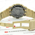 , будильник, мировое времяМировое время Полезное часовое усложнение, отображающее время в основных городах и известных областях по всему миру, оно связано с часовыми поясами, удобно для путешественников и бизнесменов. , секундомер, хронографХронографФункция позволяет измерять отрезки времени с особой точностью: часы, минуты, секунды. Верным признаком хронографа является наличие на циферблате 3 дополнительных окошек-счётчиков., календарь с индикацией текущей даты и месяца. Минеральное стекло устойчиво к возникновению царапин. Водостойкость при давлении 20 бар. Технология . Яркая светодиодная подсветкаСветодиодная подсветкаСветодиодная или LED-подсветка обеспечивает появление яркого холодного свечения за счёт LED-элементов - маленьких лампочек. Они потребляют минимальное количество энергии, чаще всего можно встретить 1 светодиод, в нижней части циферблата.. Стальной браслет с безопасной застёжкой. Золотистое IP-покрытиеIP-покрытиеМетод ионного напыления. Демонстрирует повышенную устойчивость к истиранию, окислению и химическим веществам. Под воздействием высокого давления и температуры около 1500°C молекулы металла надёжно соединяются с частицами корпуса часов.. Габариты: 43,2 x 49,3 x 13 мм.