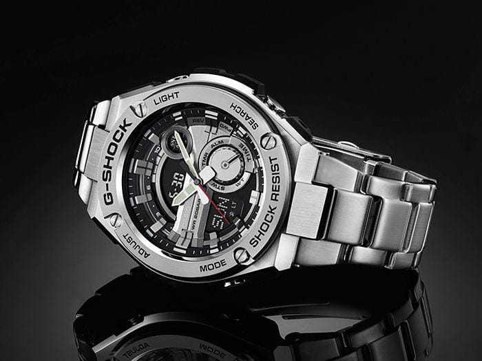 G-STEEL, сверхпрочные мужские часы, со стальным корпусом и браслетом. В этой коллекции дизайн приближается к классическому образу механических наручных часов, при этом сохранив уникальную джишоковую начинку, что делает эти часы несравнимо прочнее и функциональнее, чем их механические собратья. Сверхмощная автоматическая LED-подсветка дисплея.