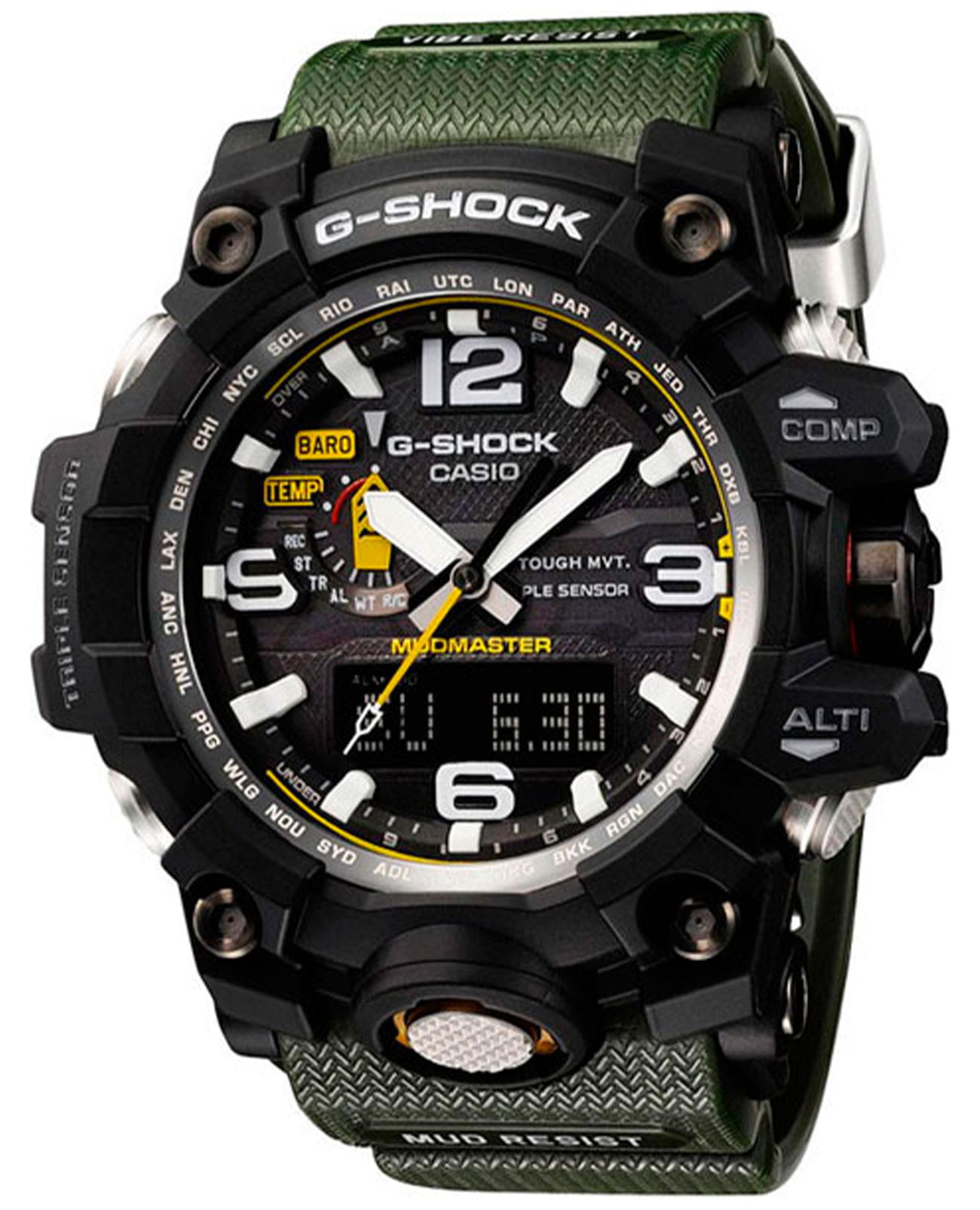 Японские мужские часы из коллекции G-Shock помогут завершить повседневный образ и порадуют владельца широким функционалом. Наручные часы серии Mudmaster привлекают брутальным дизайном с внушительным ударопрочным корпусомУдаропрочный корпусМеханизм заключён в корпус, выполненный из современных материалов, устойчивых к ударам, механическим повреждениям и падению с высоты: инновационный пластик, карбон, нержавеющая сталь, титан.. Они выполнены в стиле милитари, сочетая в себе узнаваемое оформление, прочные материалы и современные технологии. Привлекательно смотрится полимерный ремешок цвета хаки, обеспечивающий комфортное ношение. Циферблат защищает сапфировое стеклоСапфировое стеклоПрочный и надёжный материал из кристалла сапфира синтетического происхождения, характеризующийся особой твёрдостью и устойчивостью к царапинам и повреждениям. с антибликовым покрытием, устойчивое к возникновению царапин на поверхности. Корпус из высококачественного пластика. Двойная электролюминесцентная подсветкаЭлектролюминесцентная подсветкаЭлектролюминесцентная панель устанавливается под ЖК-экраном часов, при нажатии кнопки электричество преобразуется в свет за счёт подачи напряжения на атомы фосфора, такой тип подсветки позволяет освещать весь циферблат.. Питание от солнечной батареи Tough SolarTough SolarТехнология основана на подзарядке аккумулятора от источника солнечного света, специальная панель улавливает солнечные лучи и преобразует их в энергию для работы часов. Достаточно пары минут нахождения на солнце для функционирования часов в течении суток.. Индикатор заряда батарейки. Устойчивость к грязи и пыли. Включение и выключение звука кнопок. Функции: цифровой компас, барометр, термометр от -10° С до +60°С, UTCUTCВсемирное кординационное время, не имеющее привязки к географическому положению Гринвича, основывается на атомном отсчёте времени. Регулировка времени осуществляется более точно, чем устаревшее GMT.
