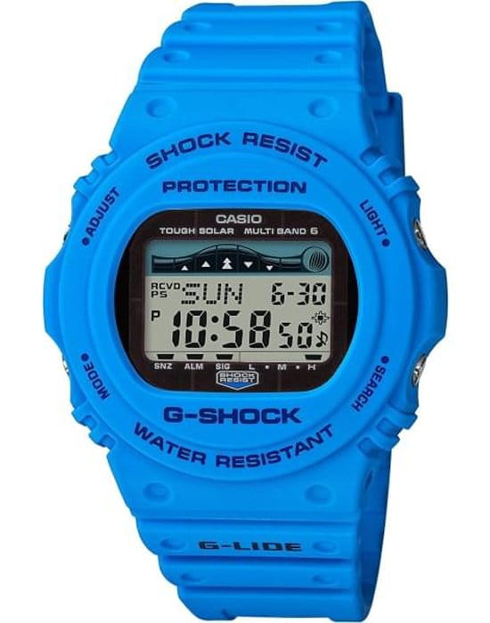 Компактная модель в олдскульном синем корпусе из профессиональной серии для серферов —G-SHOCK G-LIDE. Данная модель в голубой расцветке позволяет отображать на дисплее графики приливов и фазы Луны, что позволяет получать информацию о текущих погодных условиях для серфинга, а радио-синхронизация времени позволит автоматически корректировать текущее время в любой точке мира.