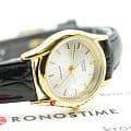 Яркий, золотой корпус часов привлекательно сочетается вместе с черным ремнем из кожи. Циферблат модели имеет круглую форму и выдержан в цвете шампань. На циферблате расположены аккуратные показатели времени и три стильные, золотые стрелки. Кварцевый механизм часов работает от батарейки. Циферблат надежно защищен от повреждений минеральным стеклом. Данная модель имеет показатель водонепроницаемости WR10. Прочный корпус аксессуара сделан из латуни.
