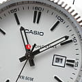 Цветовая расцветка наручных часов от Casio выдержана в сдержанных тонах. Корпус из гипоаллергенной латуни прочно закреплен с браслетом из нержавеющей стали. Застегиваются с помощью надежной раскладывающейся застежки. На круглом циферблате белого цвета расположены временные отметки в виде штрихов и арабских цифр. Часы защищены от повреждений минеральным стеклом. Водонепроницаемость равна 5 бар. Срок службы батарейки составляет 3 года. Вес часов равен 70 граммам.