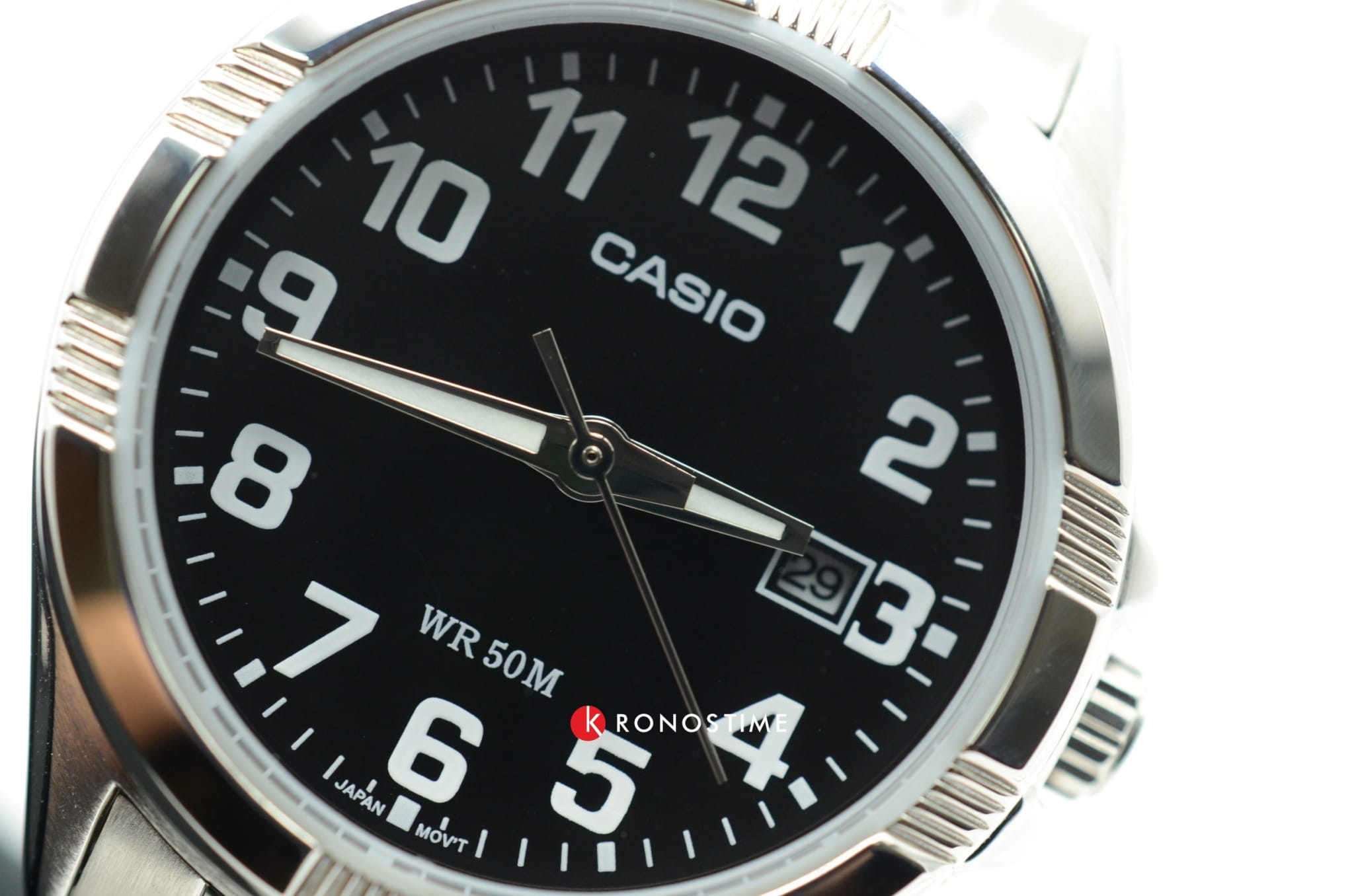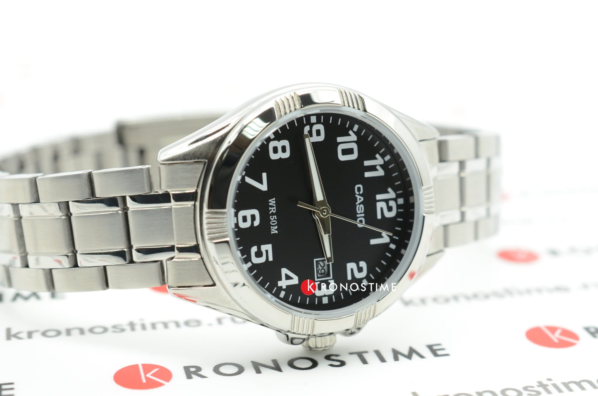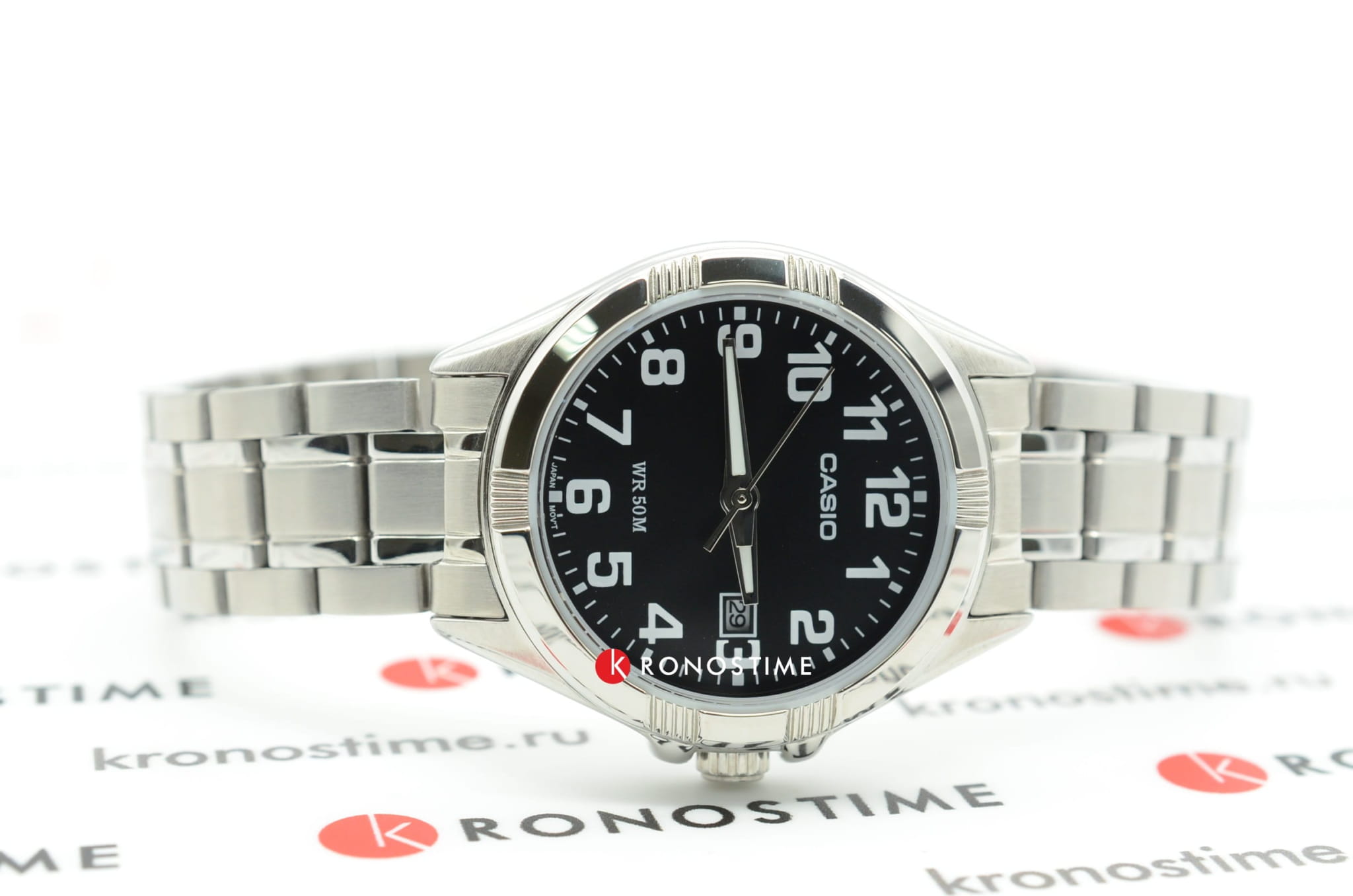 Данную модель наручных часов от Casio отличает удобство и сдержанный дизайн. Прочный, серебристый корпус из гипоаллергенной латуни соединен с браслетом из нержавеющей стали. На черном циферблат расположены временные отметки в виде арабских цифр, для удобства определения времени сделанные в белой расцветке. Благодаря неоновому, светящемуся дисплею определить время в темное время суток не составит труда. Сохранность часов обеспечивается прочным, минеральным стеклом. На дисплее отображается текущая дата. Тип механизма - кварцевый. Вес аксессуара составляет 68 грамм.