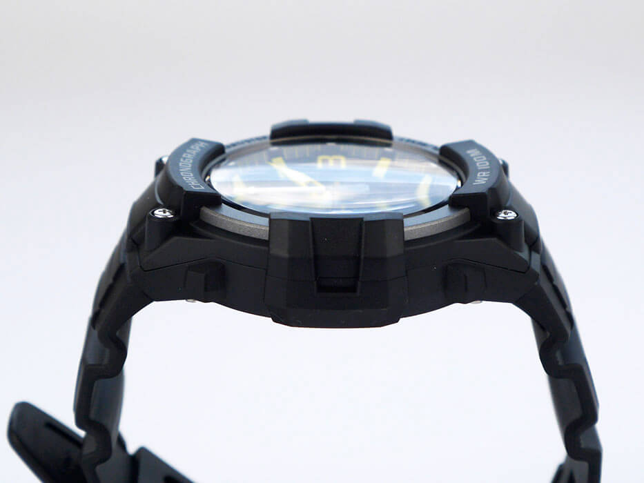 В часах имеется хронограф. Корпус и браслет черного цвета выполнены из высококачественных полимерных материалов. На дисплее отображается текущая дата. Изделие надежно защищено выпуклым акриловым стеклом. Высокая точность информации - прошедшее время отображается с точностью до доли секунды. Информация на дисплее четко видна даже в темное время суток благодаря неоновому покрытию. Высокая водонепроницаемость, которая составляет 10 Бар.