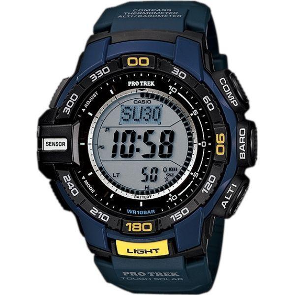 Часы, созданные для любителей активного отдыха. Питание от солнечной энергии Tough Solar - солнечные батарейки большой мощности, индикатор заряда батареи. Функция автоматического сохранения энергии. Модуль часов рассчитан на работу при низких температурах до -10°С/14°F. Технология Triple Sensor позволяет точно и легко определять сторону света, температуру и атмосферное давление. Термометр от -10° до +60°С с точностью 0,1°C. Барометр - измерение атмосферного давления от 260 до 1100 гПа (от 195 до 825 мм рт. ст.). Встроенный цифровой компас. Диапазон измерения от 0° до 359° с точностью 1°. Высотомер - встроенный датчик барометрического давления с возможностью вывода результатов в единицах высоты над уровнем моря (от -700 до 10000 метров). Секундомер с точностью показаний 1/100с и временем измерения 24ч. Сплит-хронограф. Таймер обратного отсчета от 1мин до 1ч. Функция перемещения стрелок. Функция отключения/включения звука. Будильник (5 установок). Минеральное стекло устойчиво к появлению царапин. Водонепроницаемость (10 Бар).