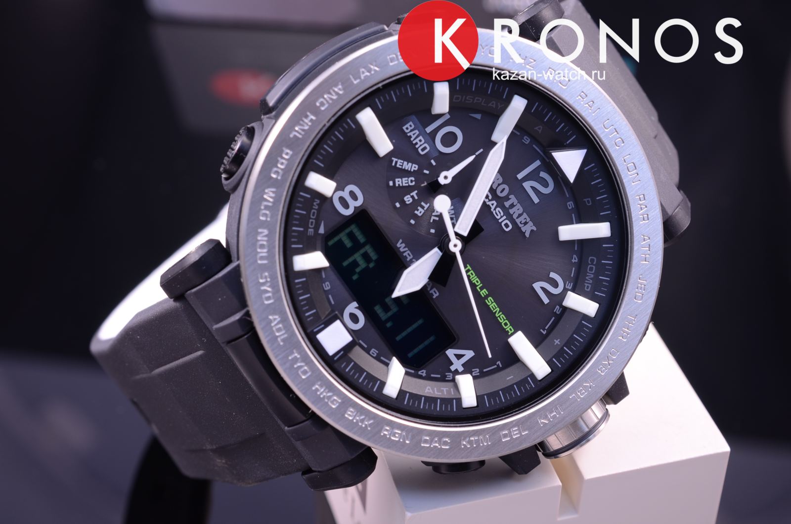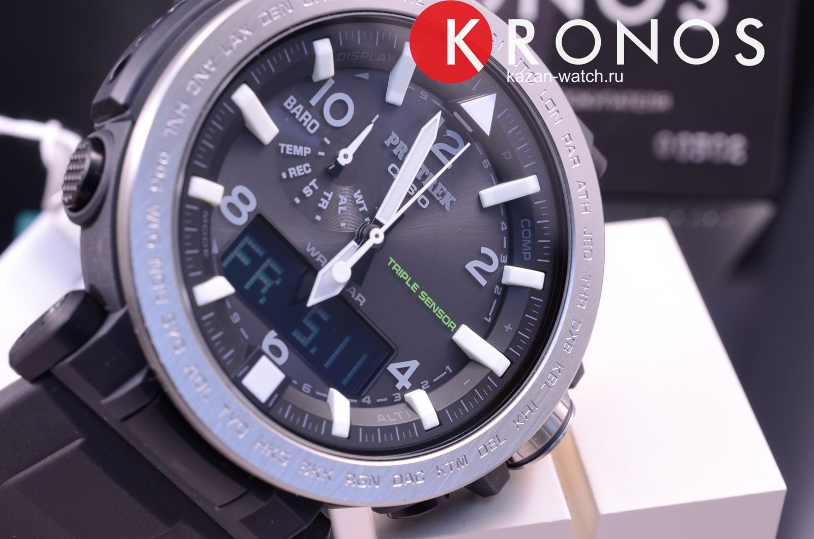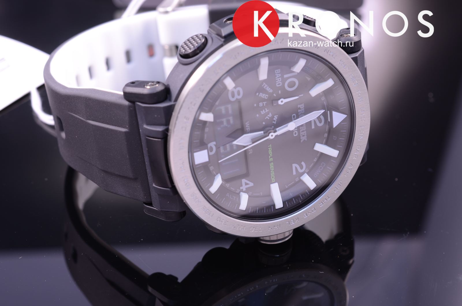 Питание от солнечной энергии -солнечные батарейки большой мощности, индикатор заряда батареи. Функция автоматического сохранения энергии. Время работы аккумулятора без подзарядки приблизительно 7 месяцев, при включенной функции сохранения энергии приблизительно 25 месяцев. Модуль часов рассчитан на работу при низких температурах до -10°С/14°F. Светонакопительное покрытие необрит продолжает светиться в темноте даже после непродолжительного пребывания на свету. Функция автоматической коррекции положения стрелок проверяет положение стрелок каждый час и корректирует его в случае необходимости. Мировое время –29 часовых поясов, всемирное координированное время . Технология Triple Sensor позволяет точно и легко определять сторону света, температуру и атмосферное давление. Термометр ,встроенный цифровой компас,высотомер - встроенный датчик барометрического давления . Хранение до 30 записей о высотных точках рельефа местности - измеренной абсолютной высоты, даты и времени. Система Smart Access с помощью электронной заводной головки обеспечивает простой и удобный доступ ко всем важным функциям часов. Нажатие или поворот заводной головки позволяет переключаться между различными режимами и активировать будильник, таймер, секундомер, а также настраивать функцию мирового времени. Секундомер с точностью показаний 1/100с и временем измерения 24ч. Сплит-хронограф. Таймер обратного отсчета от 1мин до 1ч. Функция перемещения стрелок. Функция отключения/включения звука. Завинчивающаяся заводная головка с защитой. Люминесцентная внутренняя поверхность ремешка.