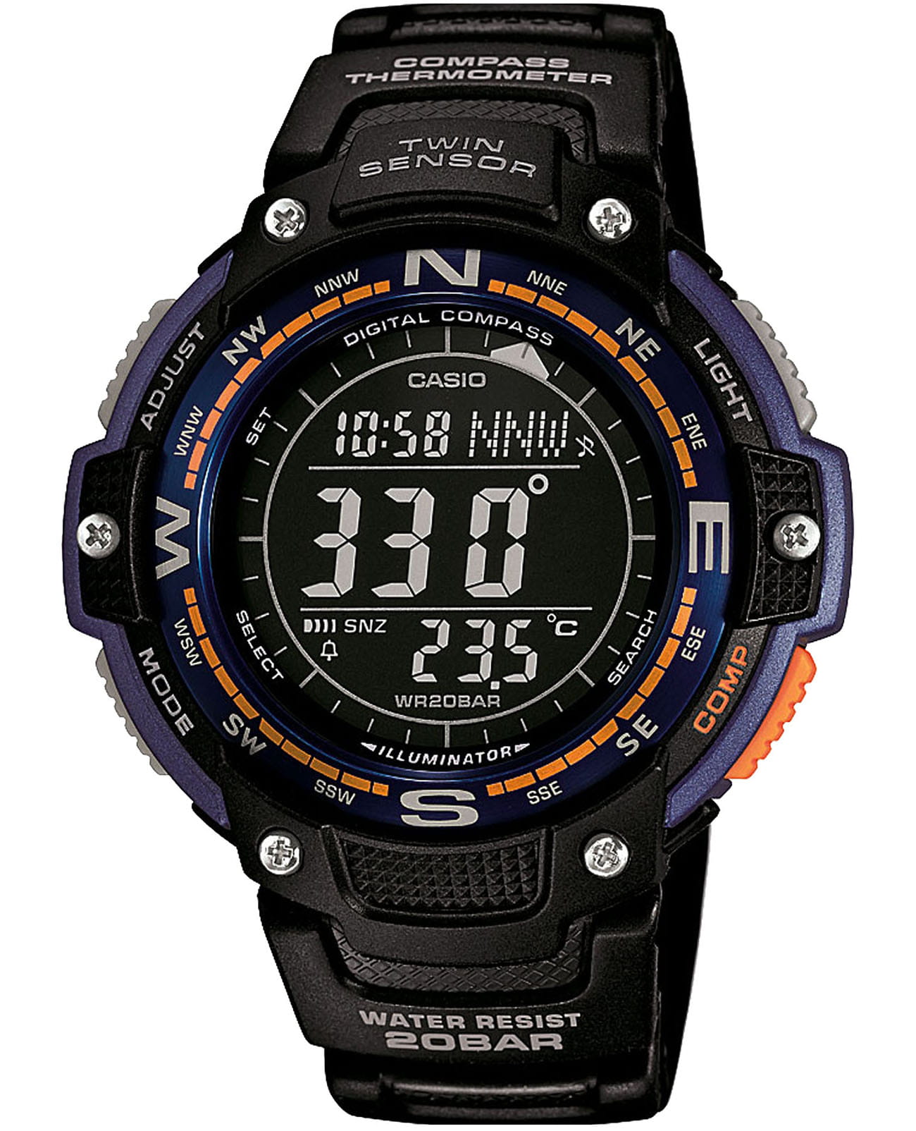 Корпус и браслет многофункциональных и стильных часов от Casio выполнены из высокопрочных полимерных материалов. Есть функции для определения погоды. Часы способны выдержать температуру даже ниже, чем -10 °C. Секундомер измеряет прошедшее время с точностью в 1/100 секунды. Быть максимально пунктуальными помогут 5 независимых будильников. Встроен цифровой компас. Электролюминесцентная подсветкаЭлектролюминесцентная подсветкаЭлектролюминесцентная панель устанавливается под ЖК-экраном часов, при нажатии кнопки электричество преобразуется в свет за счёт подачи напряжения на атомы фосфора, такой тип подсветки позволяет освещать весь циферблат. обеспечивает видимость информации в темноте. Высокая водонепроницаемость в 200 WR.