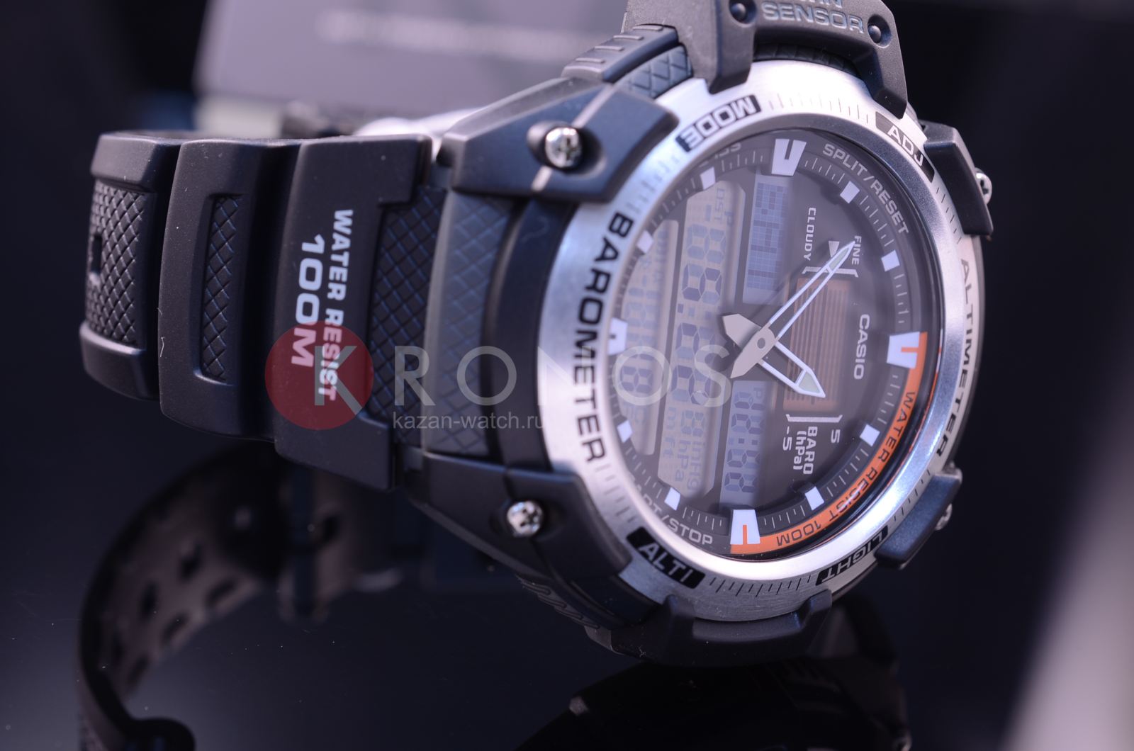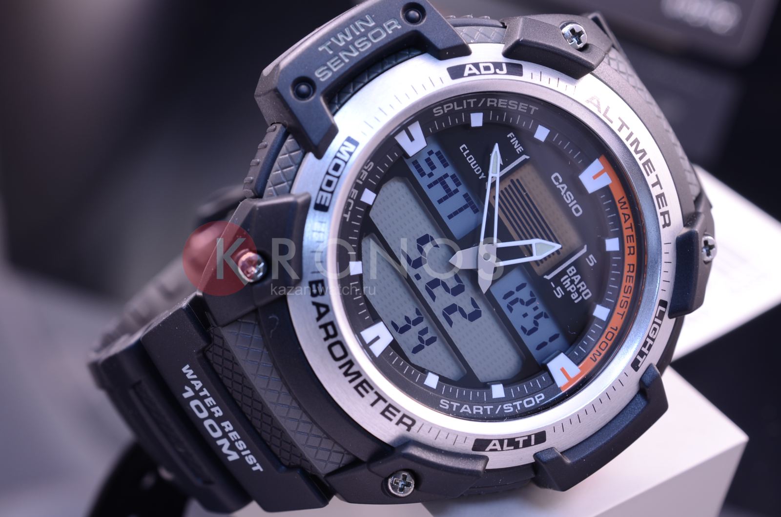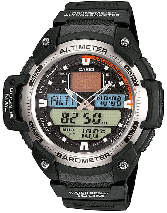 Спортивные мужские часы SGW-400H-1B. Оснащены датчиком температуры, альтиметром, барометром и удобной электролюминесцентной подсветкой, освещающей весь циферблат. Корпус - Пластиковый; Стекло - Пластик; Водозащита - 100 м. (WR 100); Материал ремешка - Каучуковый; Цвет ремешка - Черный; Цвет циферблата - Lcd.