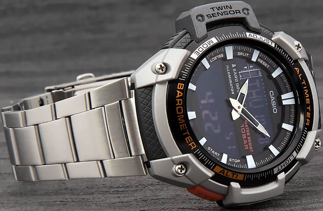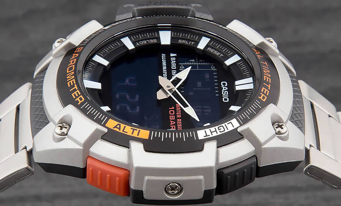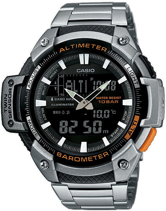 Японские мужские наручные часы SGW-450HD-1B. Круглый корпус выполнен из алюминия и пластика. Часы оснащены такими дополнительными функциями как секундомер, таймер обратного отсчета, высотометр, термометр, компас, альтиметр. Корпус - Пластиковый; Стекло - Минеральное; Водозащита - 100 м. (WR 100); Материал ремешка - Нержавеющая сталь; Цвет ремешка - Серебристый; Цвет циферблата - Lcd.