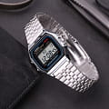 Японские наручные часы с хронографом Casio Vintage A159W-N1, кварцевый механизм с высокой точностью. Класс водозащиты: 30 метров, позволит защитить корпус от случайных брызг или капель дождя. Корпус часов изготовлен из стали, серебристого цвета. ХронографХронографФункция позволяет измерять отрезки времени с особой точностью: часы, минуты, секунды. Верным признаком хронографа является наличие на циферблате 3 дополнительных окошек-счётчиков.. Циферблат подсвечивается светодиодом. СекундомерСекундомерСекундоме́р — прибор, способный измерять интервалы времени с точностью до долей секунды. с точностью показаний 1/100 сек и временем измерения 1 ч. 12-ти и 24-х часовой формат времени. Раскладывающаяся застежка.