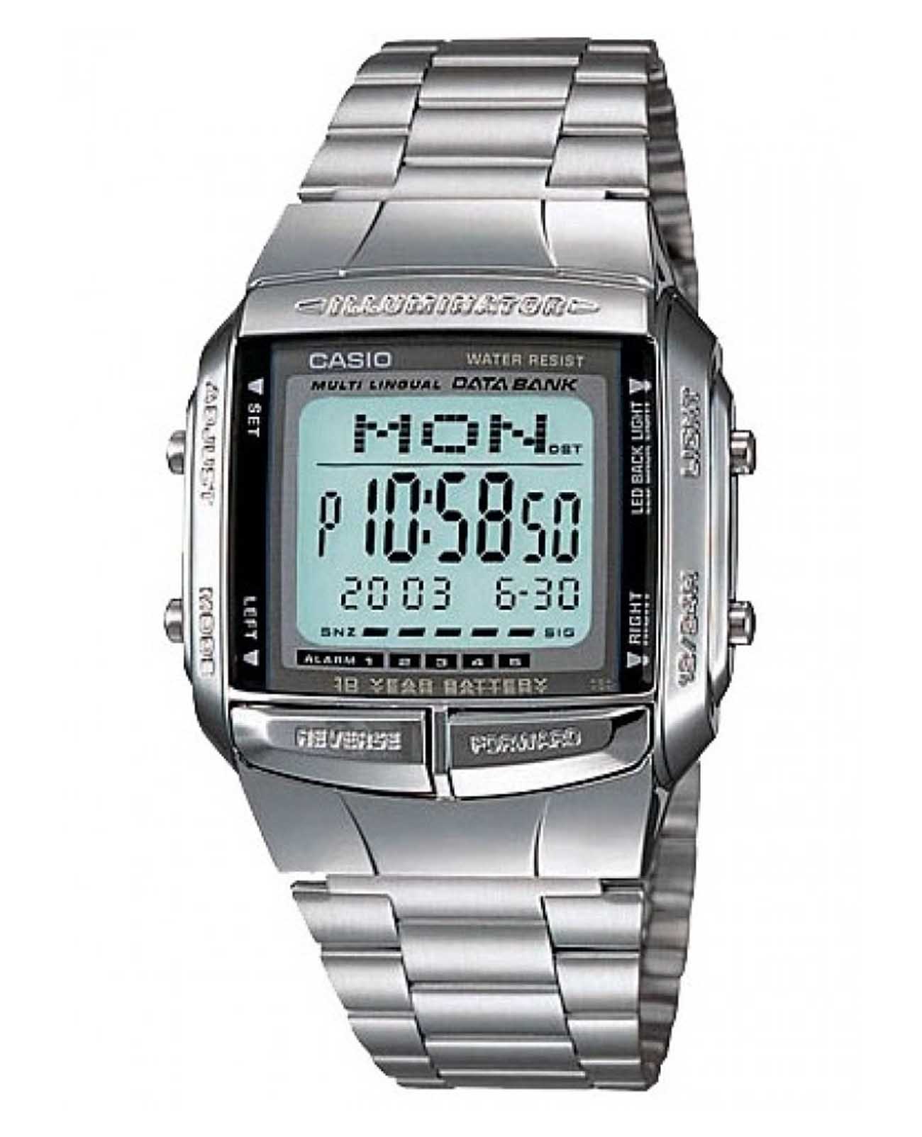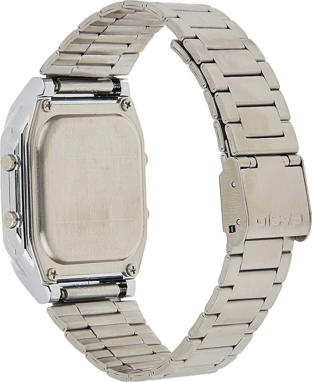 Наручные часы от Casio будут одинаково привлекательно смотреться как с деловым костюмом, так и с повседневным образом. Яркий дизайн выдержан в стиле винтаж. Корпус сделан из высокопрочного пластика. Браслет выполнен из стали. Благодаря раскладывающейся застёжке, потеря аксессуара сведена к минимуму. Есть записная книжка, в которую можно сохранять до 30 контактов. Светодиодная подсветкаСветодиодная подсветкаСветодиодная или LED-подсветка обеспечивает появление яркого холодного свечения за счёт LED-элементов - маленьких лампочек. Они потребляют минимальное количество энергии, чаще всего можно встретить 1 светодиод, в нижней части циферблата.. Гладкая серебристая поверхность плавно отображает падающий свет и добавляет аксессуару привлекательности.