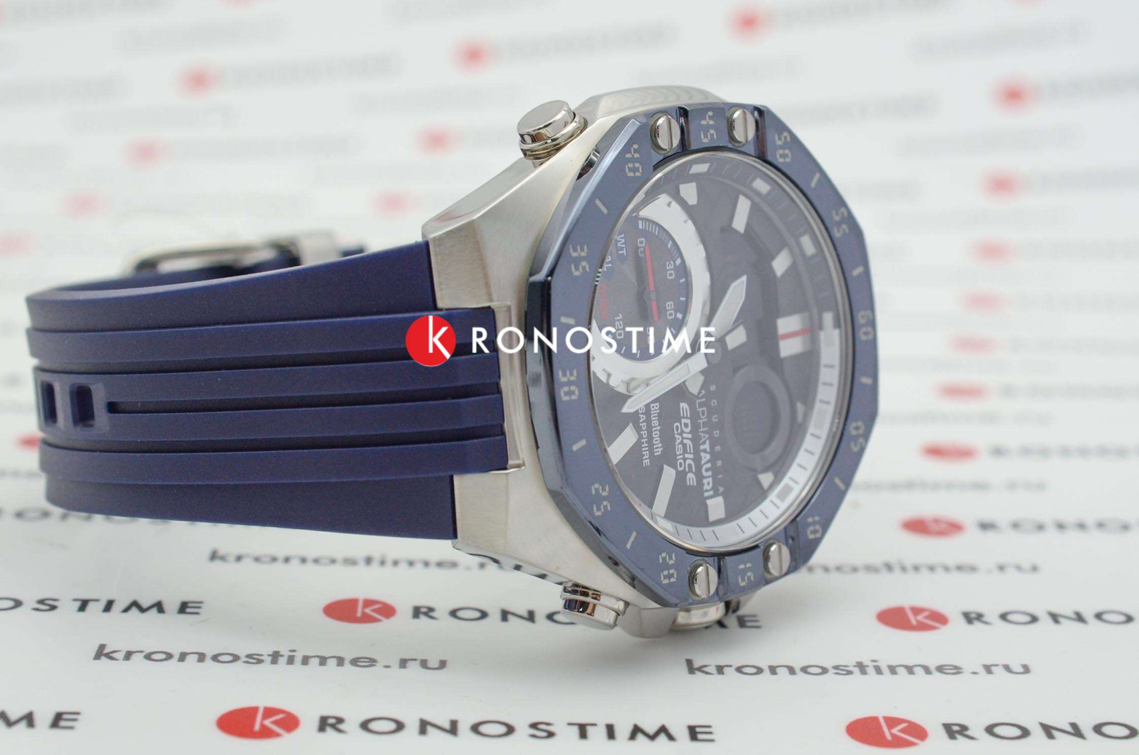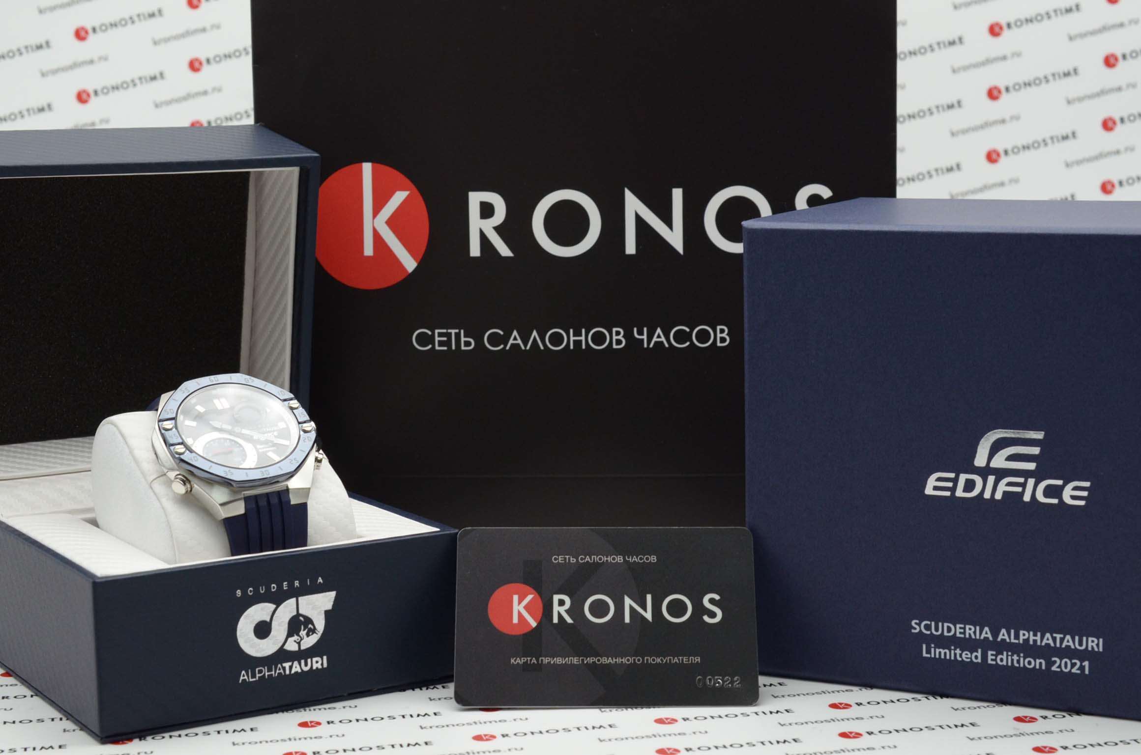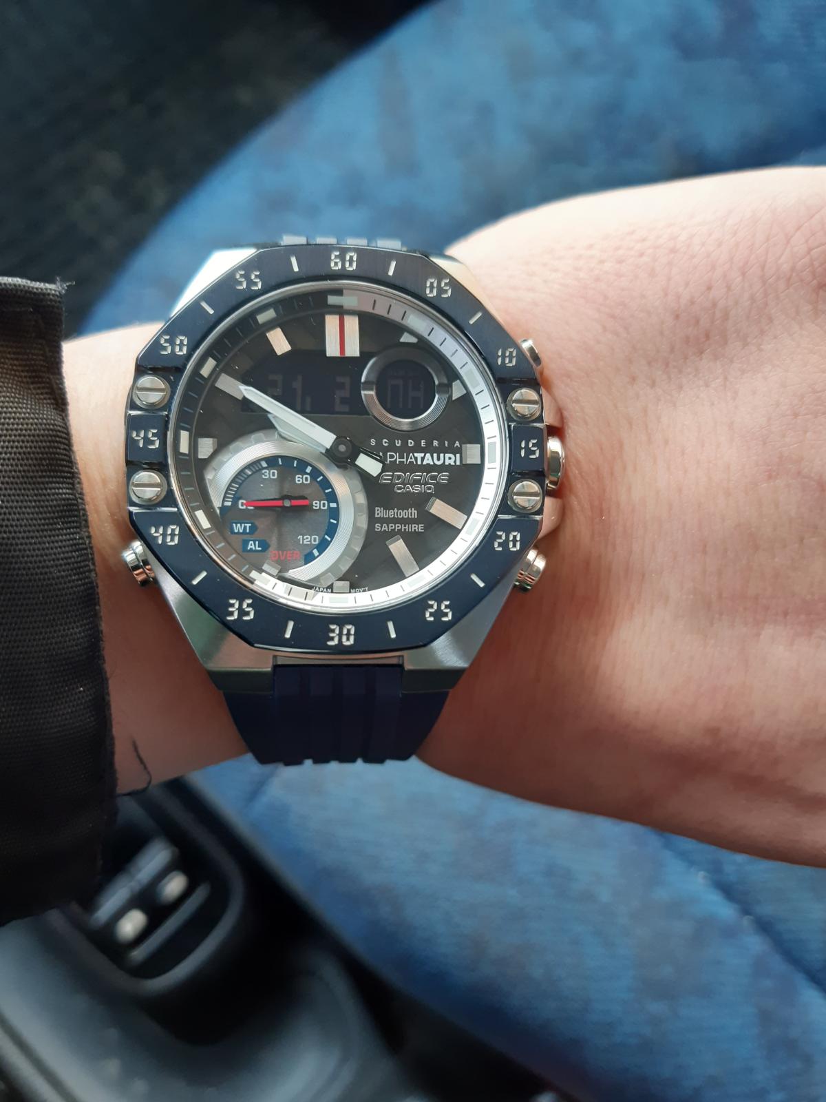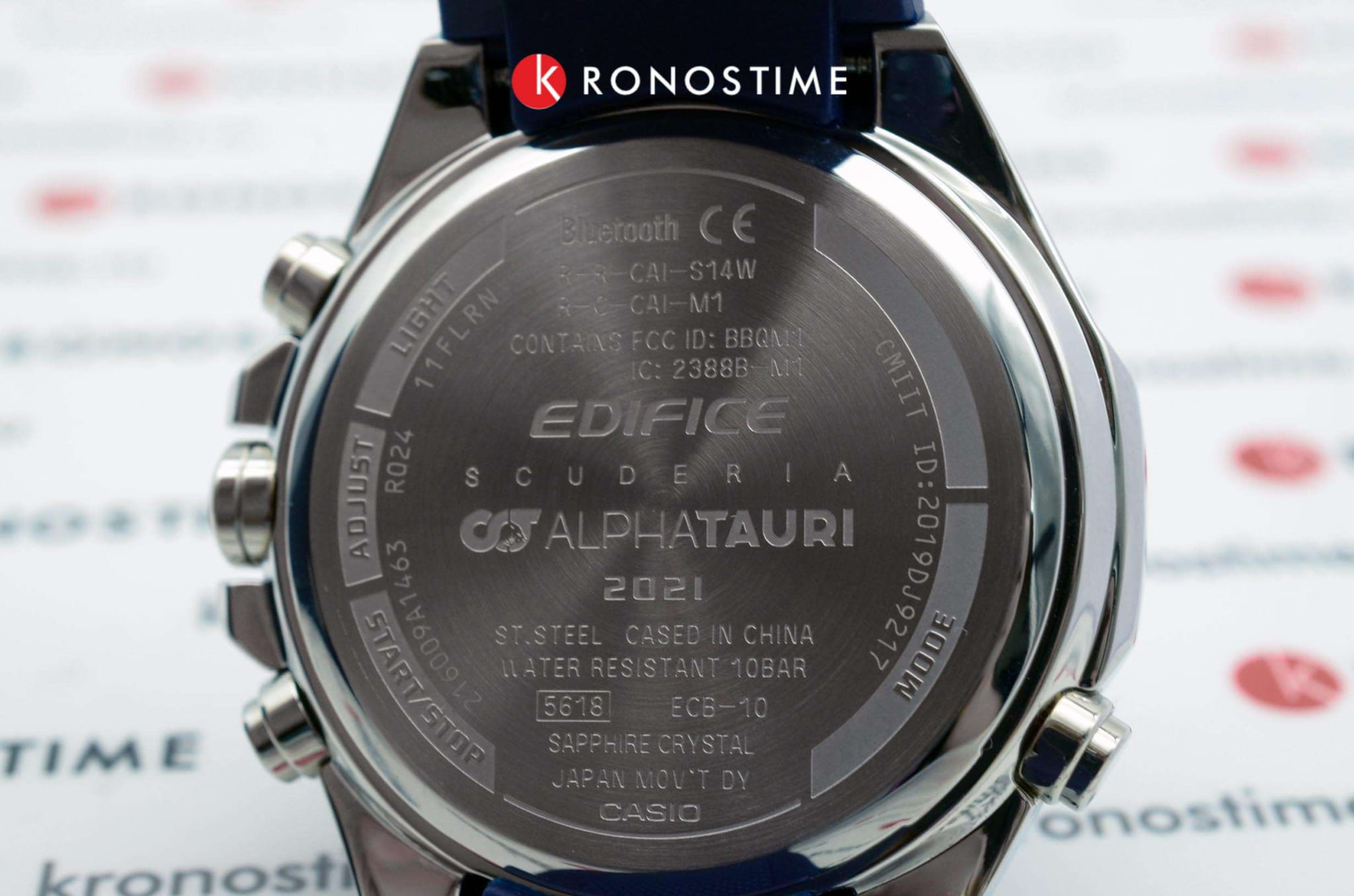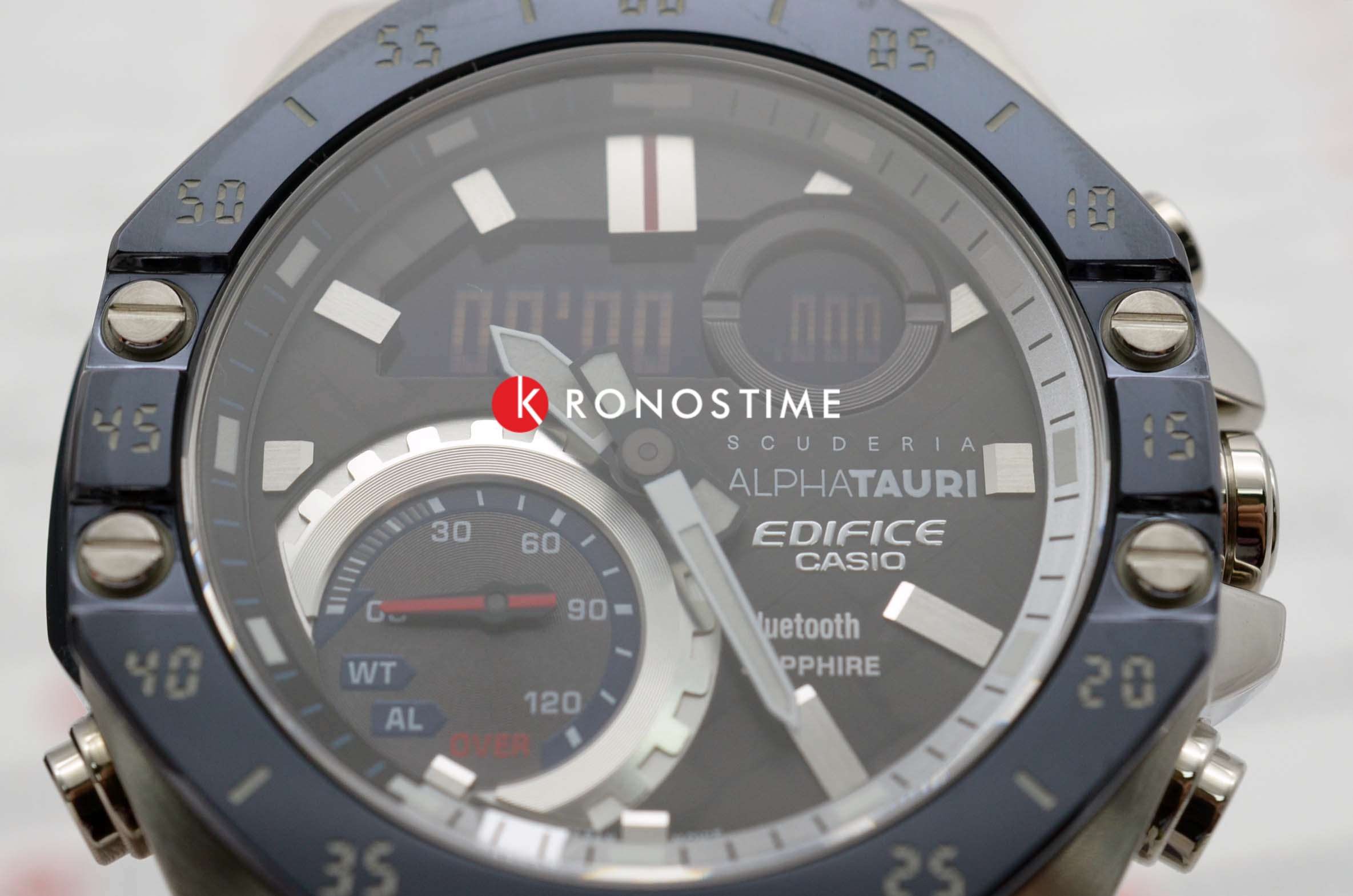 Casio Edifice ECB-10AT-1A – лимитированная модель, созданная в сотрудничестве с командой Формулы-1 Scuderia AlphaTauri. Корпус размером 48,5 мм и толщиной 12,5 мм выполнен из нержавеющей стали с IP-покрытиемIP-покрытиеМетод ионного напыления. Демонстрирует повышенную устойчивость к истиранию, окислению и химическим веществам. Под воздействием высокого давления и температуры около 1500°C молекулы металла надёжно соединяются с частицами корпуса часов. чёрного цвета, обеспечивающим прочность и устойчивость к коррозии. Циферблат выполнен из 6K карбона, что придаёт ему уникальный и технологичный вид, а его поверхность защищена сапфировым стекломСапфировое стеклоПрочный и надёжный материал из кристалла сапфира синтетического происхождения, характеризующийся особой твёрдостью и устойчивостью к царапинам и повреждениям. с антибликовым покрытиемАнтибликовое покрытиеСлой оксида металла в 0,13-0,3 микрон, благодаря которому стекло часов не бликует и не отражает свет. Антибликовое покрытие уменьшает отражение света в 10 раз, обеспечивая отличную читаемость показателей циферблата., устойчивым к царапинам.